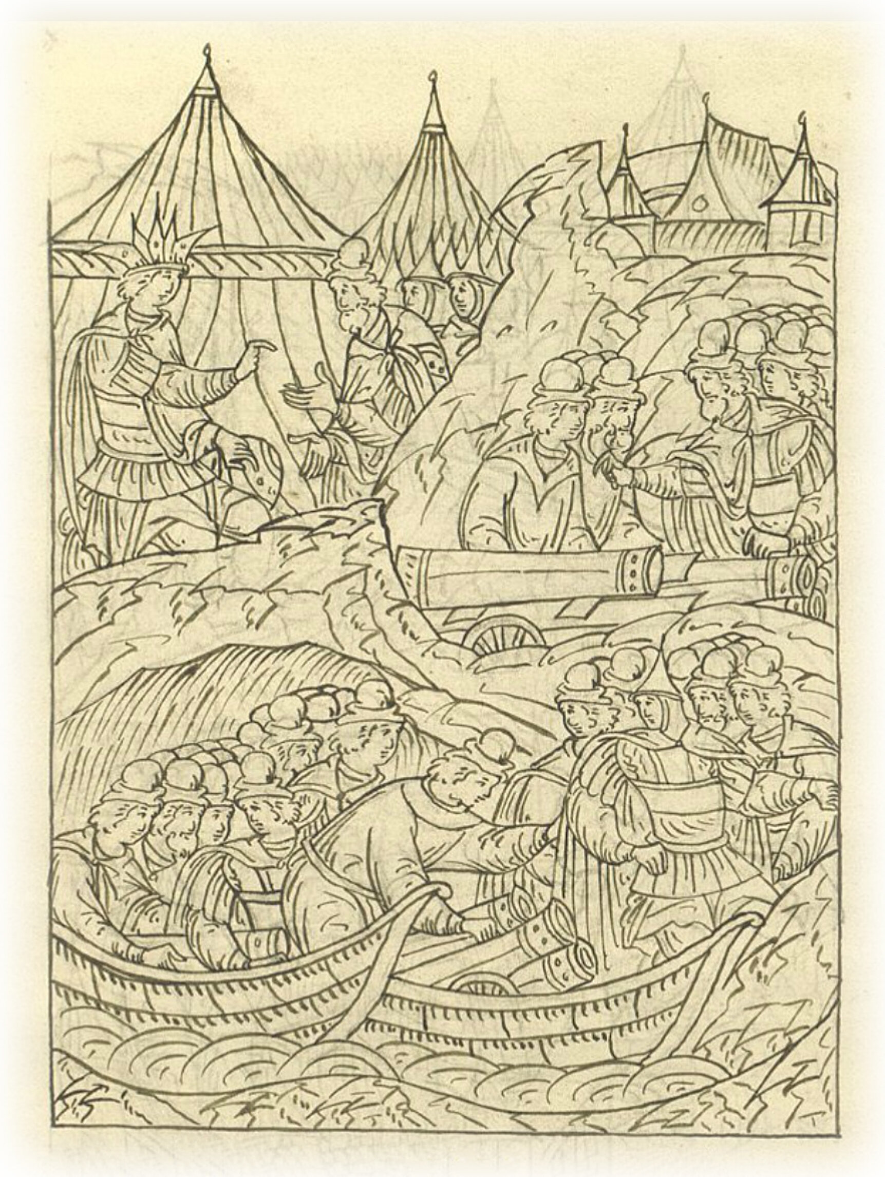 И повелел государь военное снаряжение из судов вынимать и устраивать, чтобы ему идти к городу. В воскресенье и в понедельник государь там стоял.