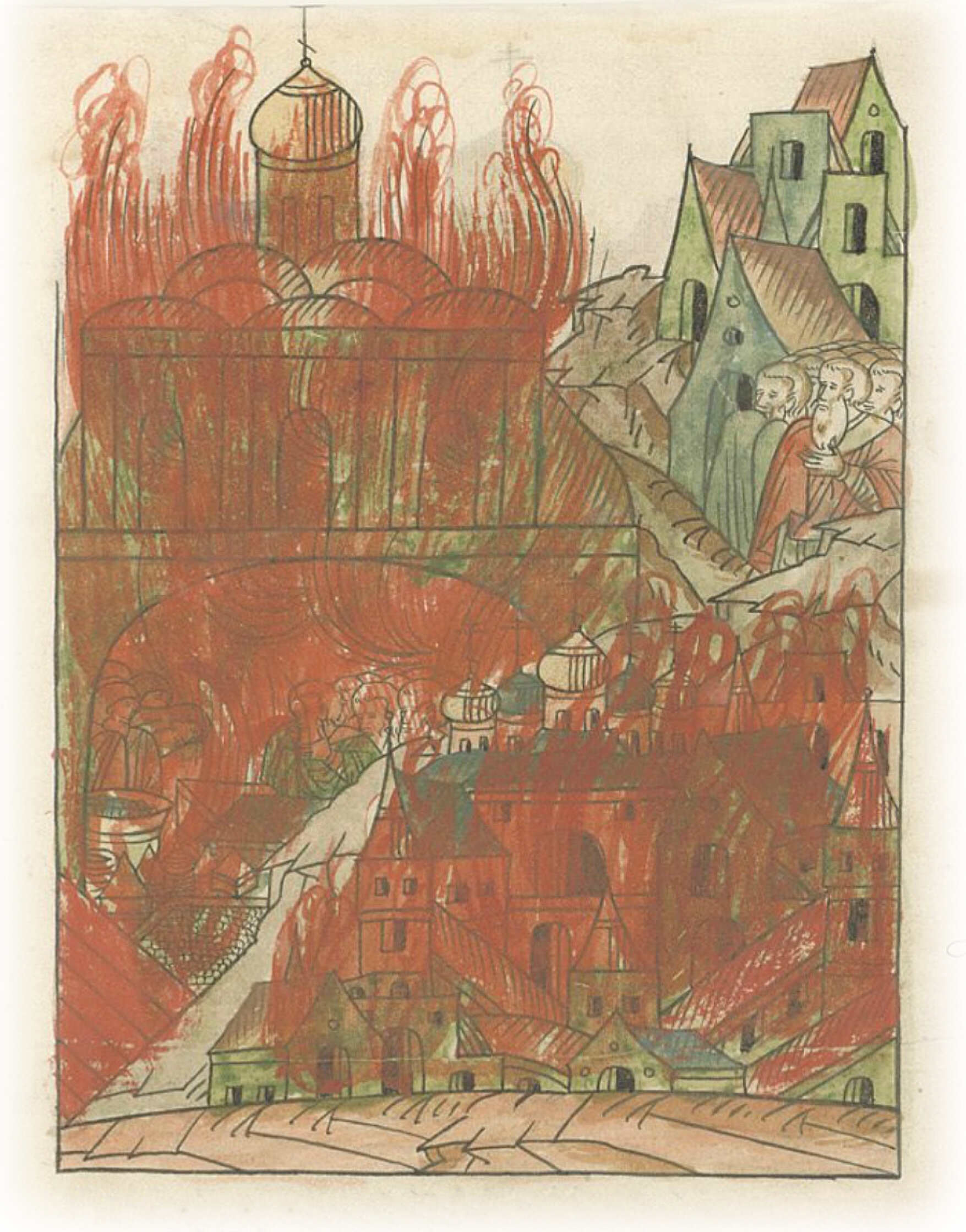 Еще же в том городе и тот вышеназванный монастырь Рождества Пречистой (Богородицы) сгорел; в ту церковь собралось множество иноков и мирских (людей) со множеством имущества, но Божьим попущением и внутри той церкви все выгорело вместе с людьми.
