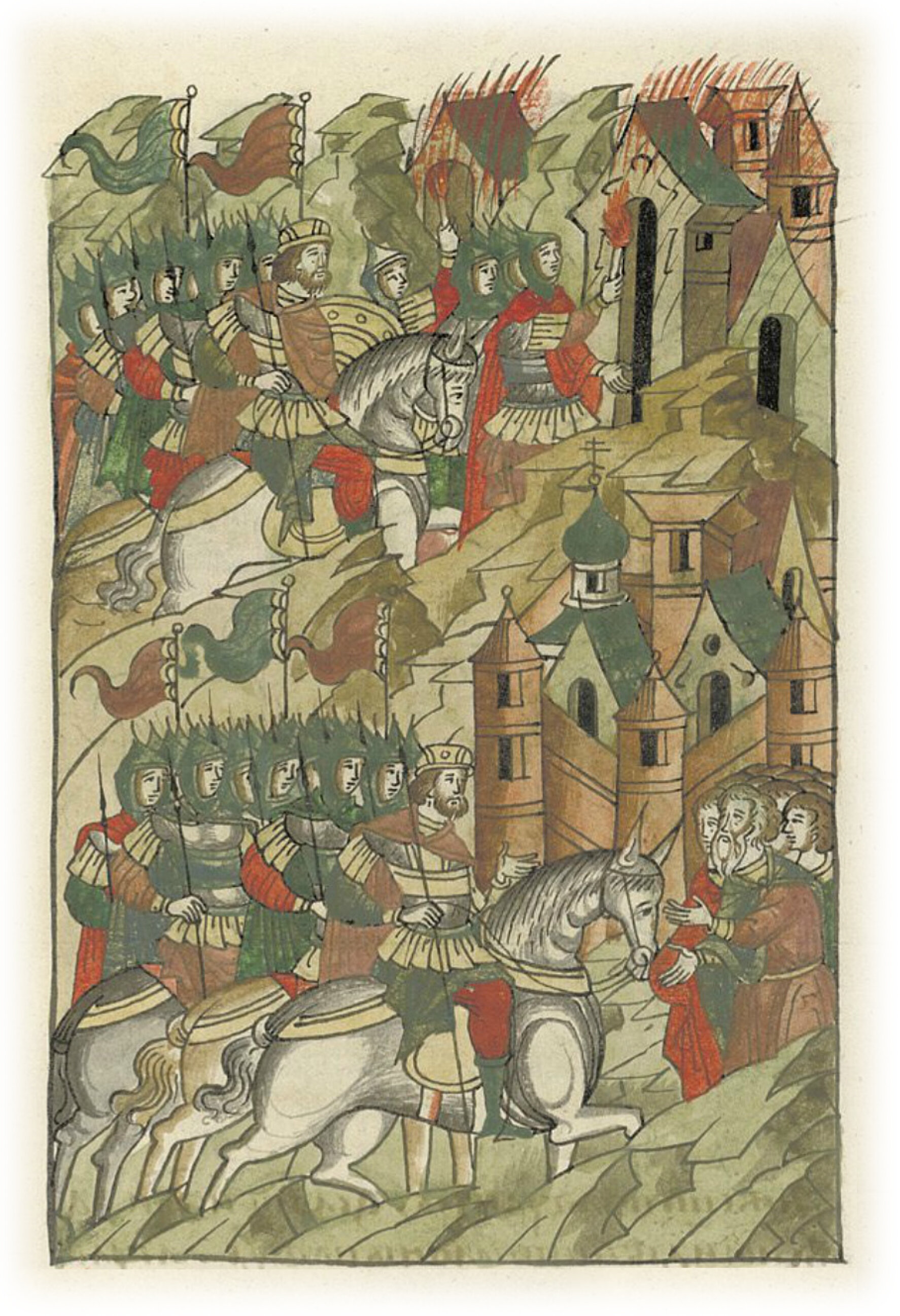 он пошел против них к Торжку, волости и села сжег, а города не сжег, так как обещали новоторжцы дань дать, но солгали.
