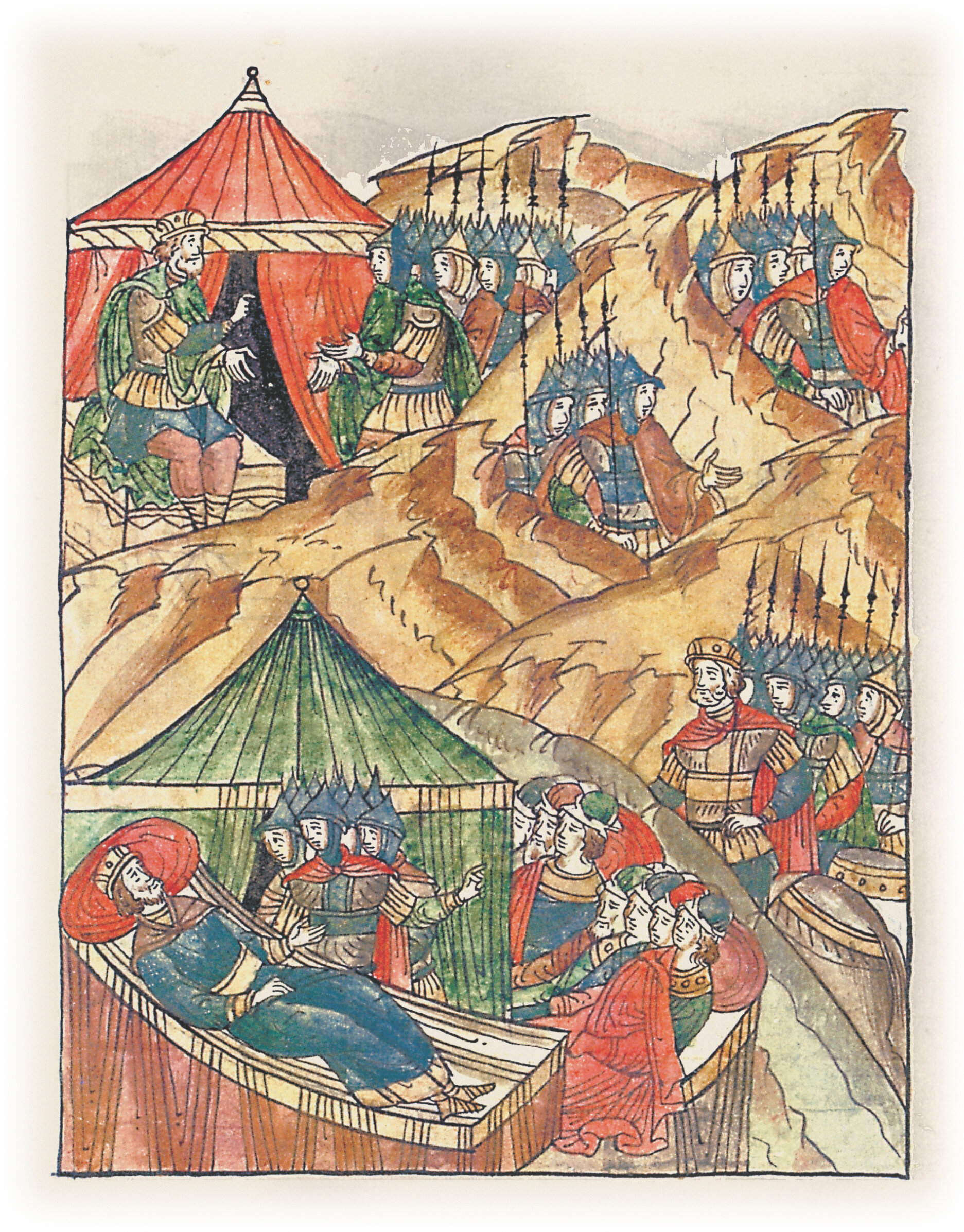 Ночью сторожа князя Мстислава Изяславича прибегают с вестью, что на них идет князь Владимирко Галицкий с огромным войском.