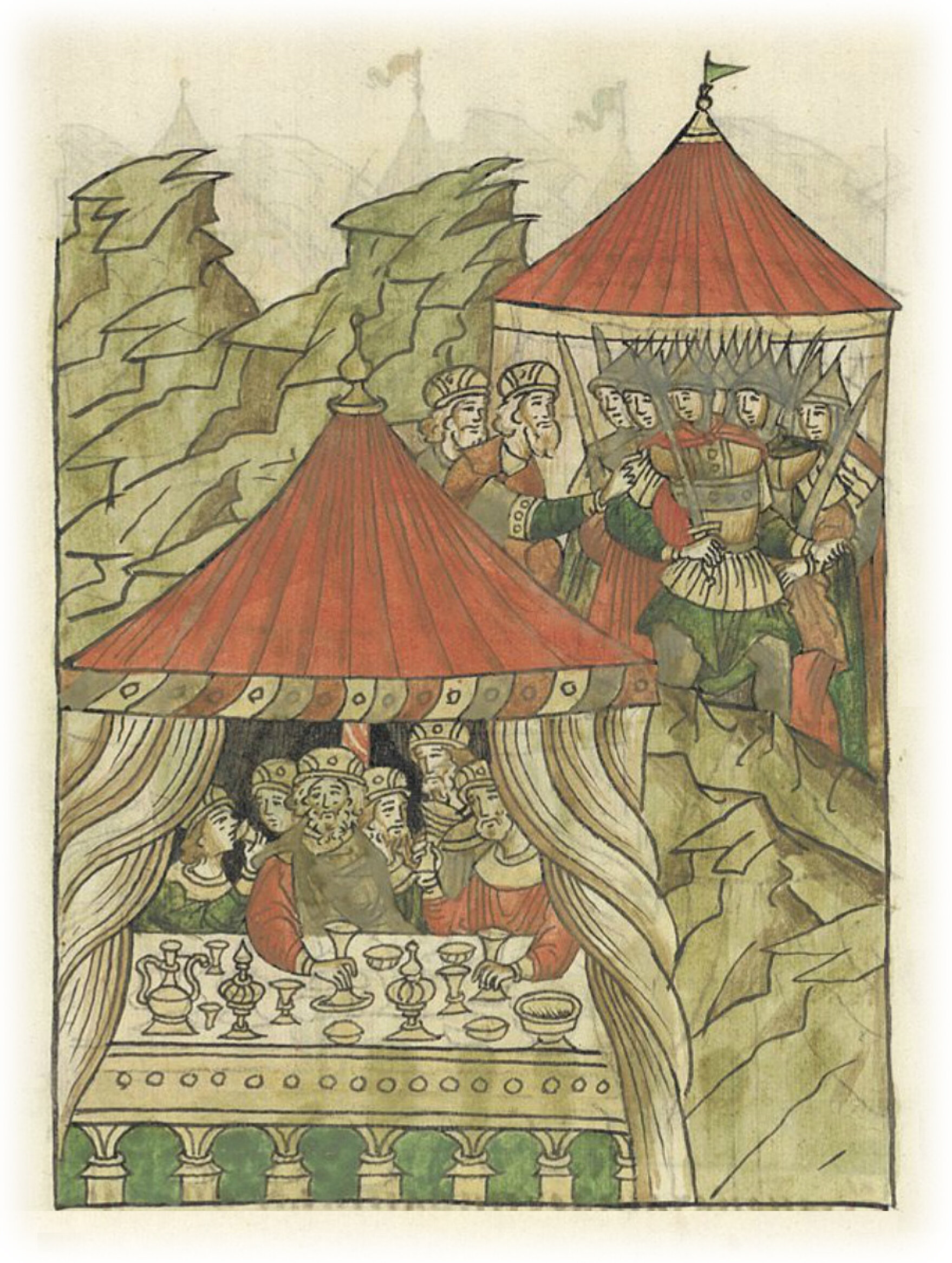 Окаянный же Глеб с братом своим Константином собрал дворян своих и половцев множество с оружием, и скрыл их в другом, постельном шатре, в полстнице*, вблизи шатра, в котором князья собирались пировать. Не знал об этом никто, кроме тех зломысленных князей и их проклятых думцев. * шатер из войлока.