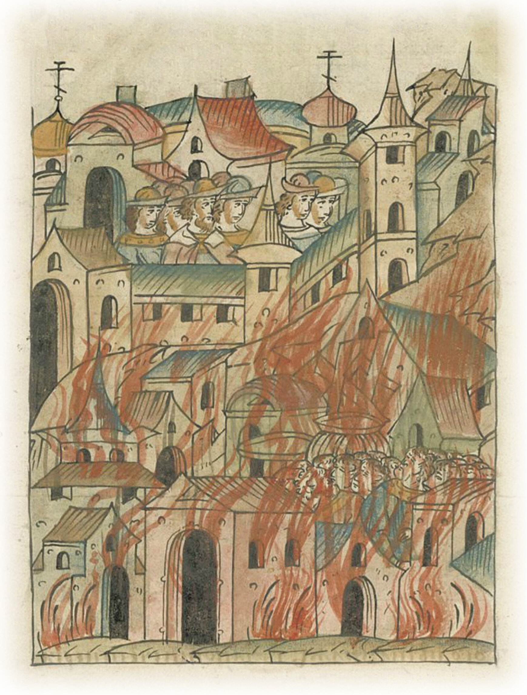 И в ту же пятницу в седьмом часу дня загорелось внезапно зелье пушечное на Москве в Успенском овраге, на Алевизонском дворе; потому что на том дворе делали его городские люди. И сгорело делателей зелья того в один час более двухсот человек; а ко двору тому и к иным дворам Божьим хранением не прикоснулся огонь.