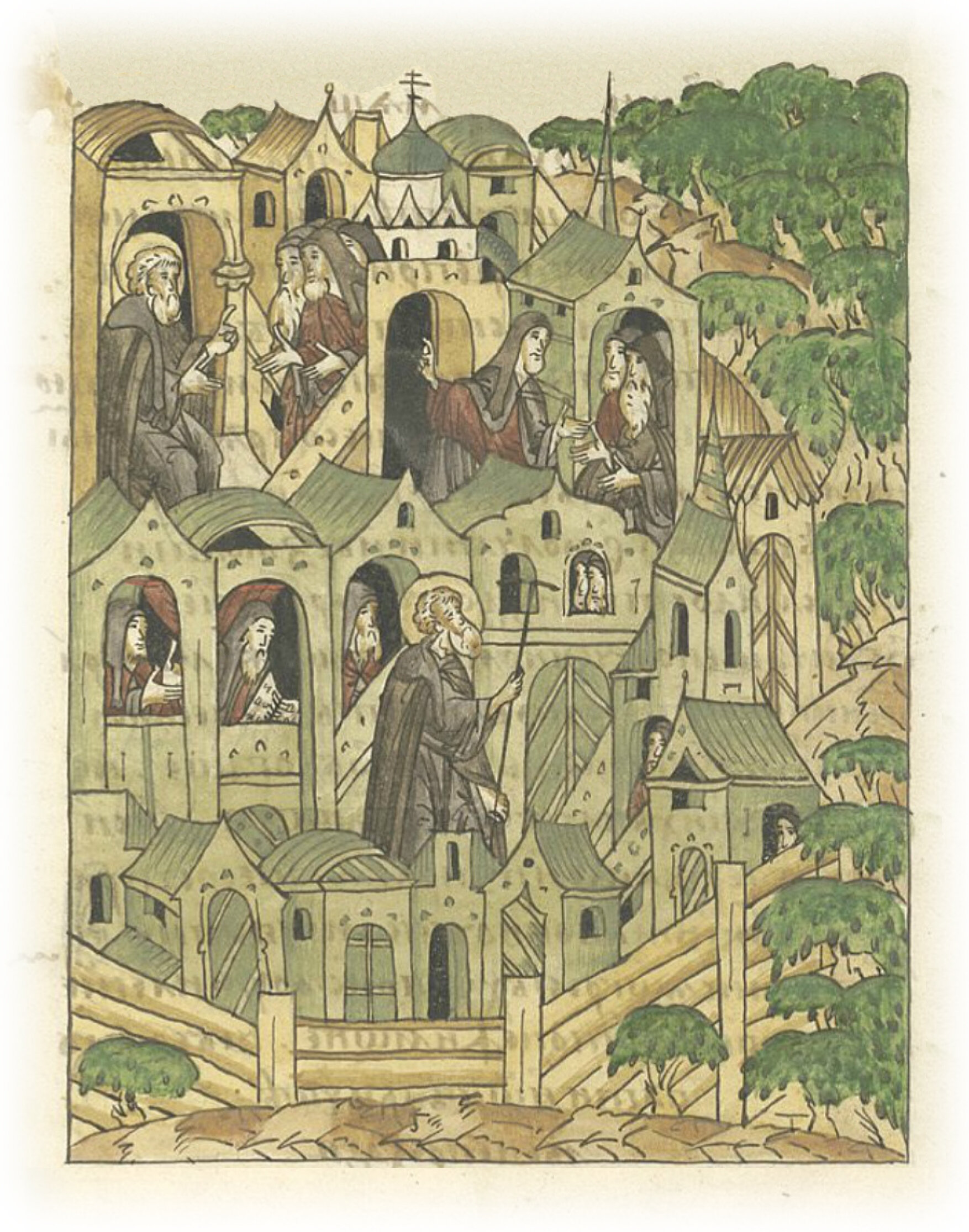 Повесть о преподобном Сергии Радонежском. Преподобный игумен Сергий поучает своих монахов и милостиво наказывает непокорных.