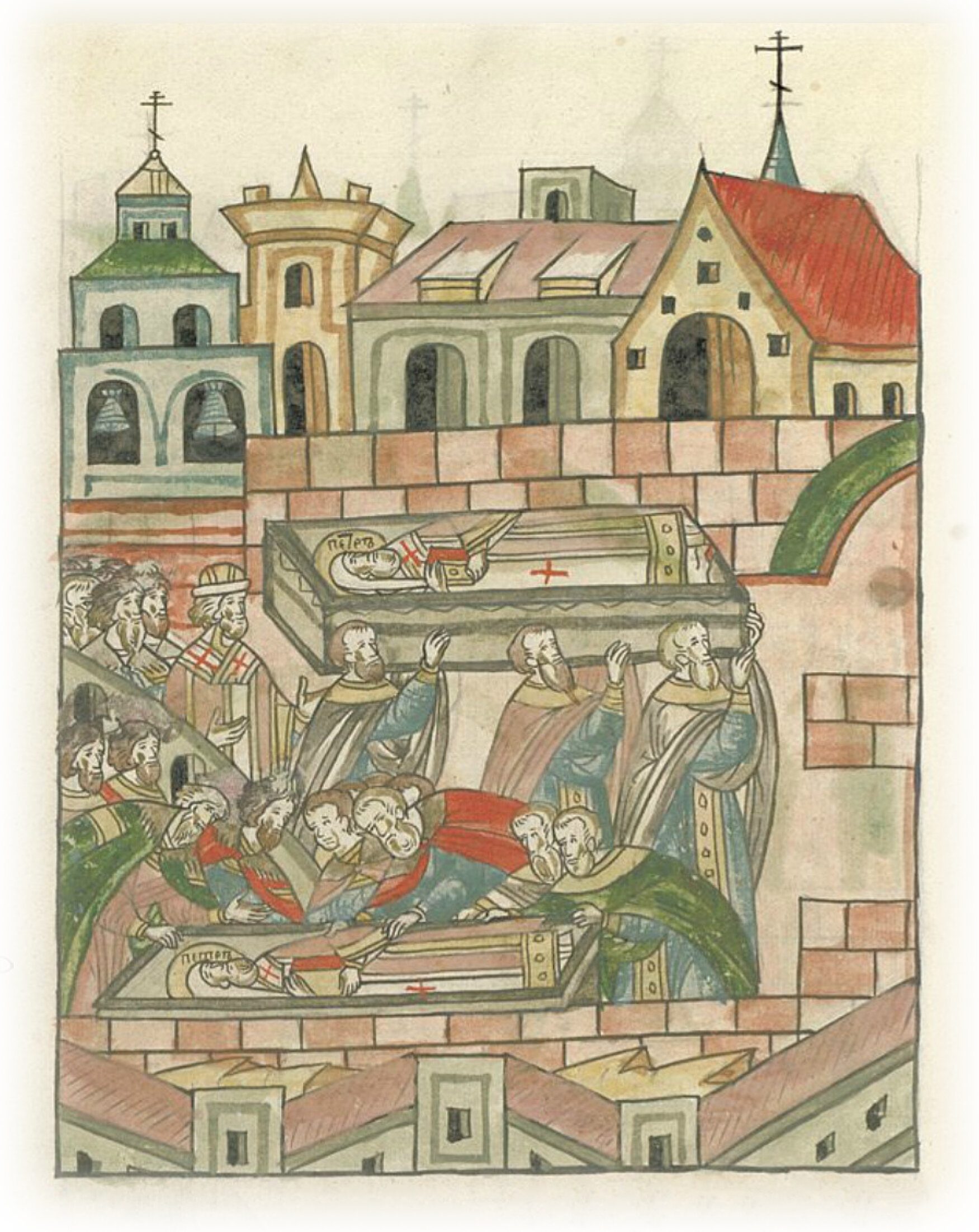 Создание соборной церкви Успения пресвятой Богородицы в Москве митрополитом всея Руси Филиппом. Перенесение мощей чудотворца Петра. Великий князь с сыном, братьями и боярами прикасаются ко гробу святого, который ставят на приготовленное место.