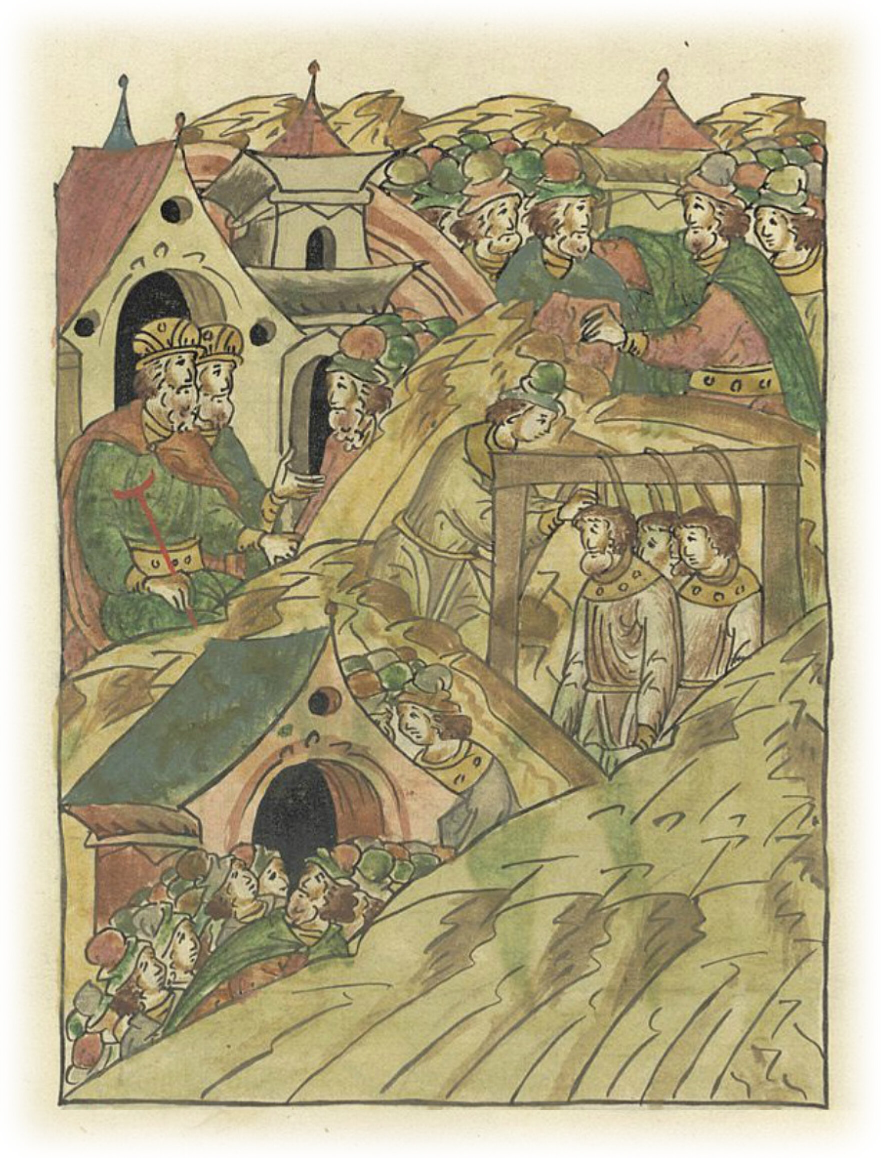 И недолго были в мире, в любви и правде, и опять размирились, не сумев обуздать себя, захватили многих бояр и людей Всеволода и Ярослава, и, оковав, а иных в погреба засадив, уморили, а иных повесили.
