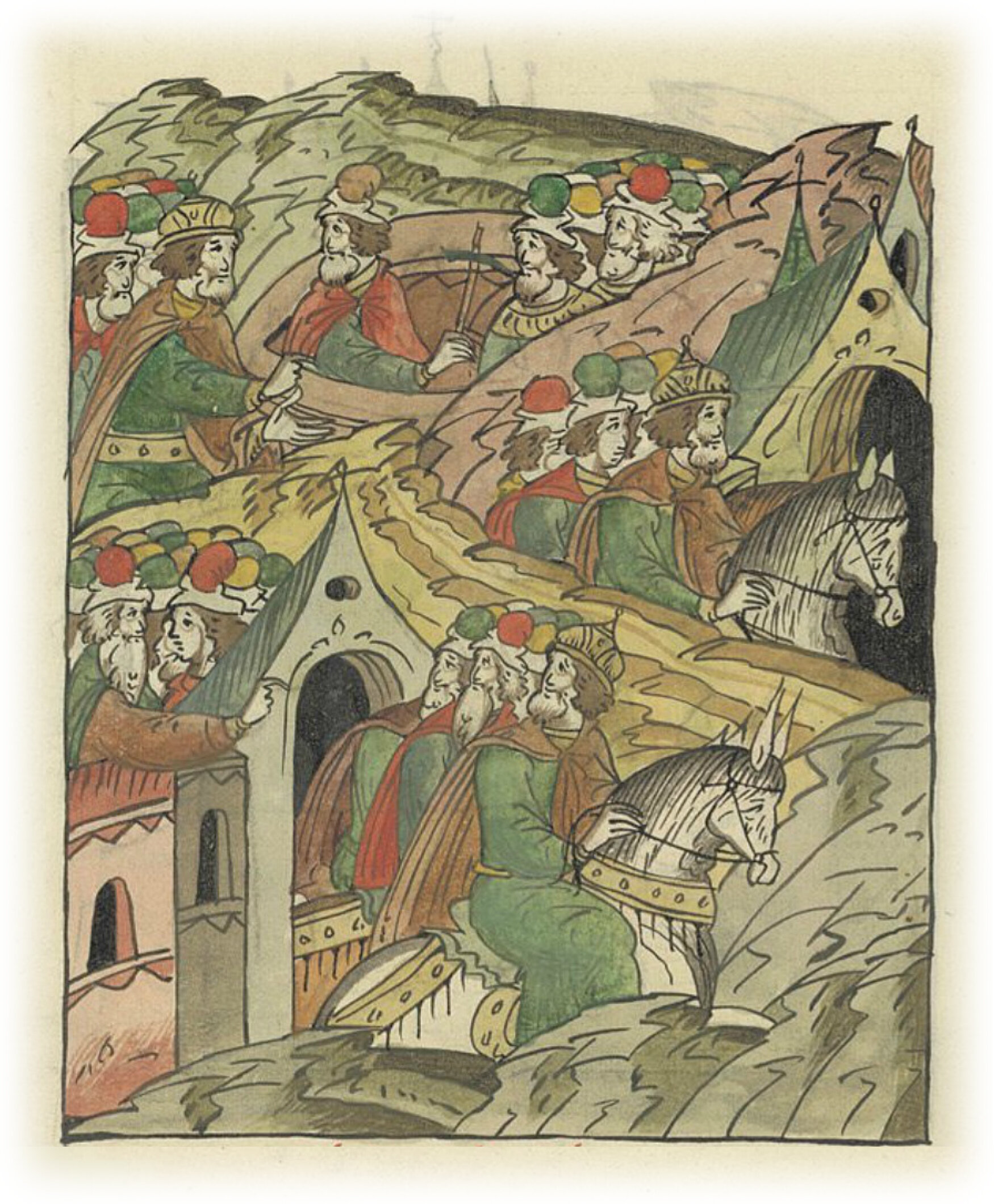 Воеводы царя Ивана Васильевича, разделившись, идут в погоню за царем Емгурчеем.