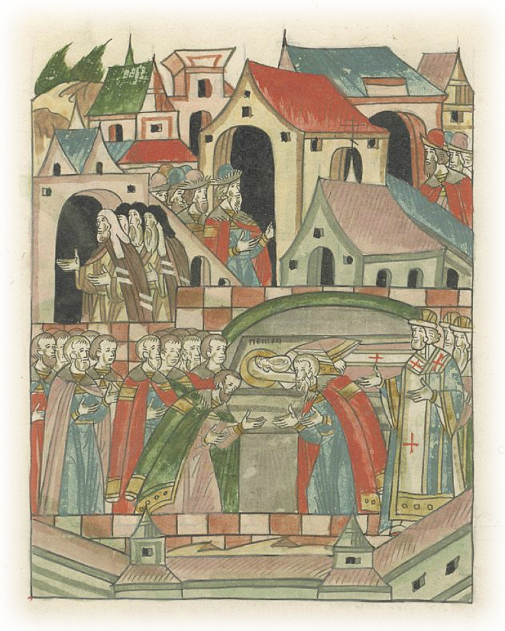 Создание соборной церкви Успения пресвятой Богородицы в Москве митрополитом всея Руси Филиппом. Перенесение мощей чудотворца Петра. Люди прикладываются к открытым мощам чудотворца Петра.