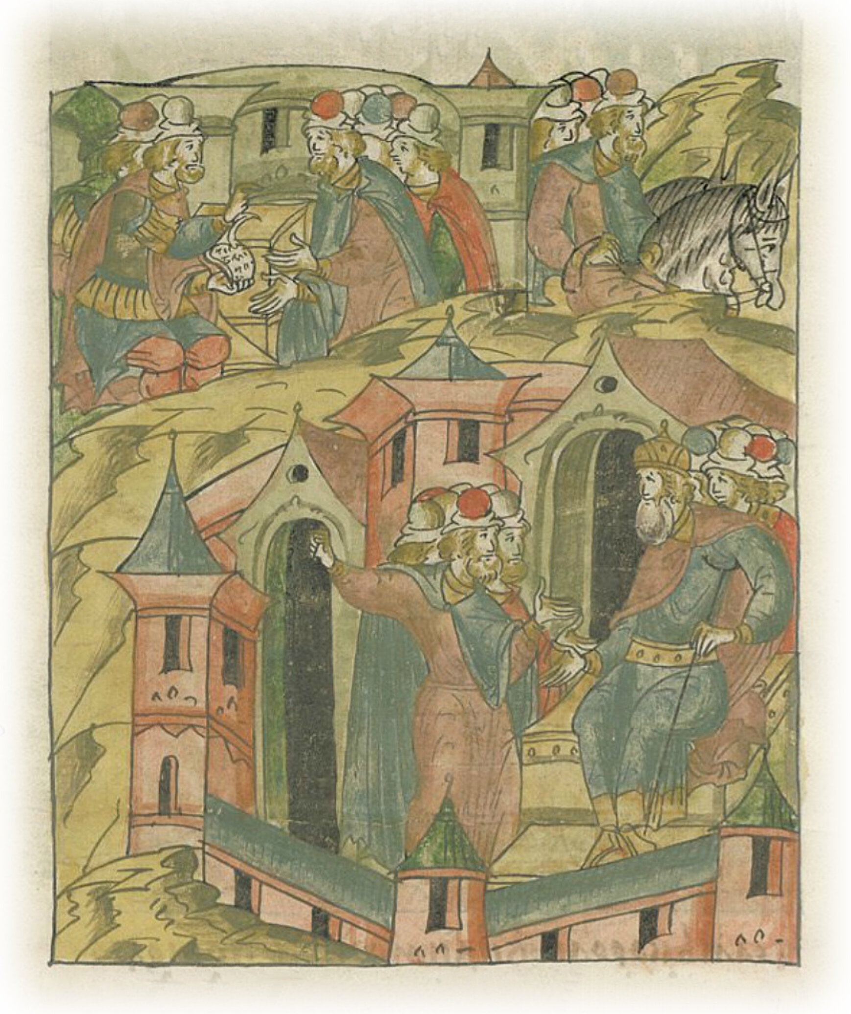 Ругодивские посадники Яким и Захар приезжают в Москву. Воеводы царя Ивана Васильевича Алексей Адашев и Иван Михайлов сообщают им, что государь пожалует их, если сдадут его воеводам помимо Ругодива Вышгород.