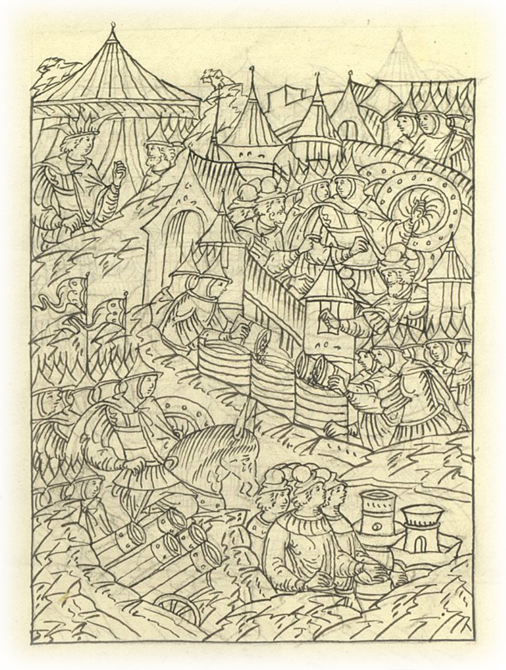 Взятие Казанское. Воеводы же князь Михаил Иванович и Алексей Данилович на стенах городских и в городе в башне повелели крепкими щитами закрыться и туры засыпать землею, и сидели на стене два дня и две ночи, ожидая приступа.
