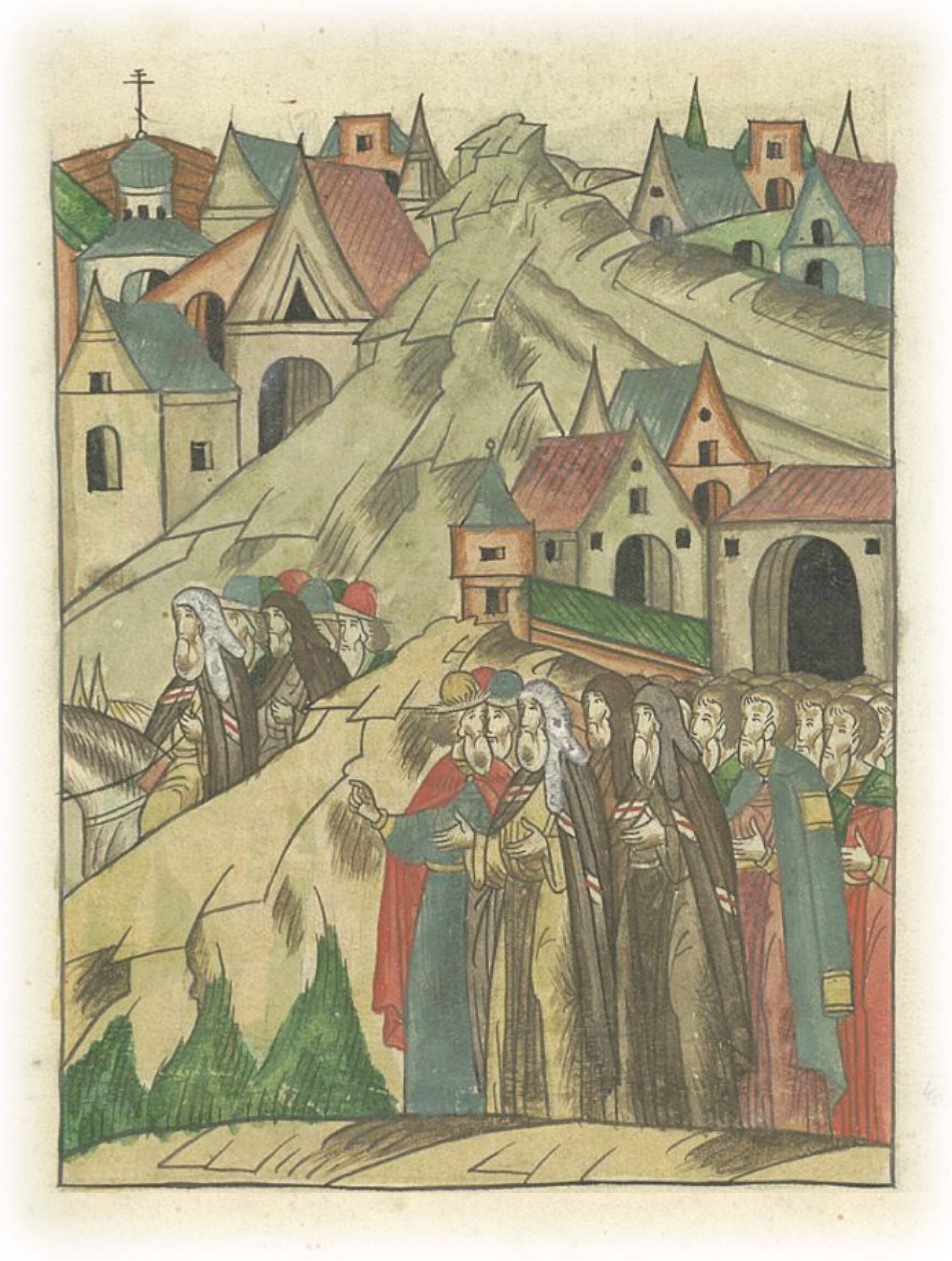 О походе митрополита Пимена в Царьград со Смоленским владыкой Михаилом и Спасским архимандритом Сергием. Великий князь Олег Иванович Рязанский провожает их.