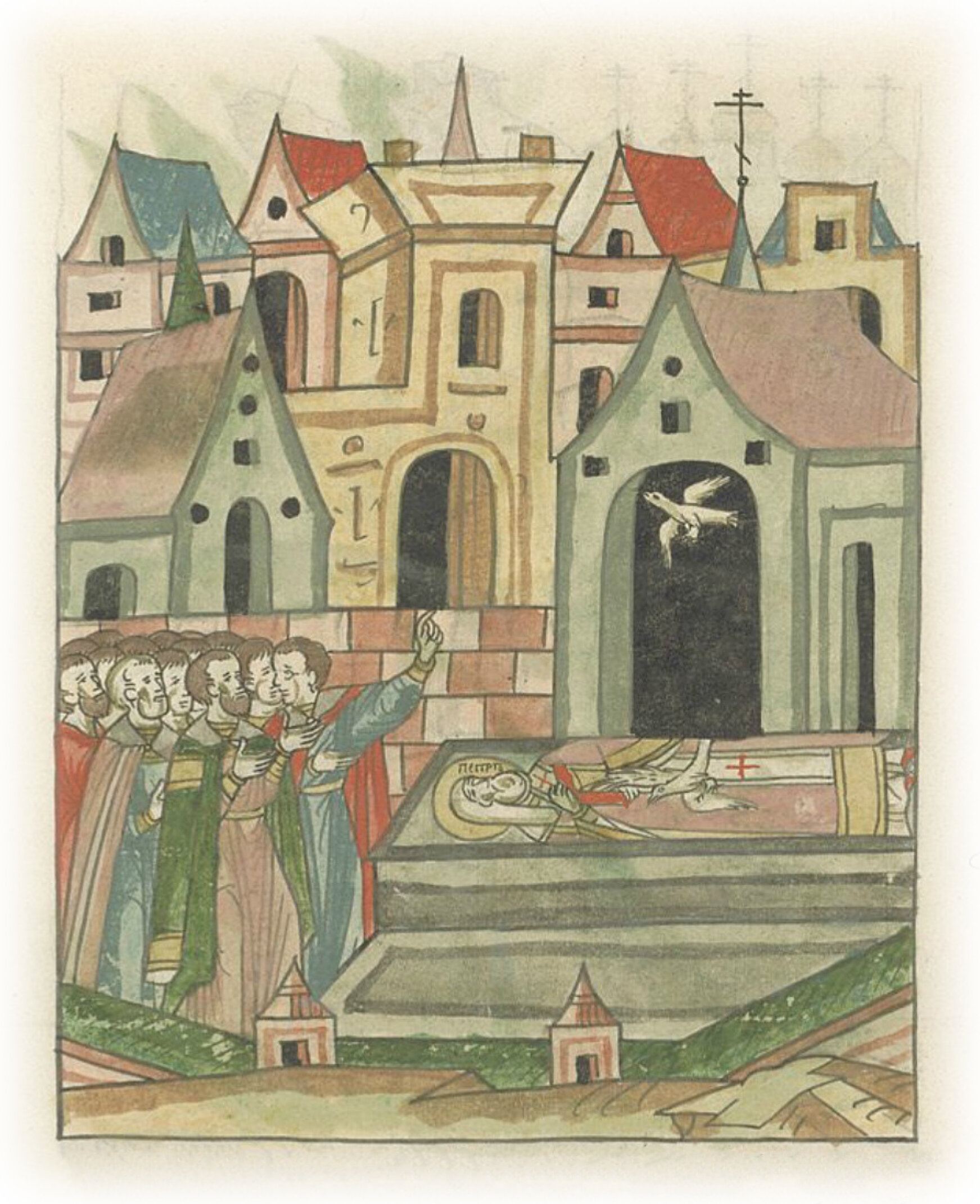 Некие же благоговейные из священников во время принесения честных мощей святого видели голубя белого над гробом его, превысоко парящего, до тех пор, пока не покрыли мощи святого, и тогда невидим стал.