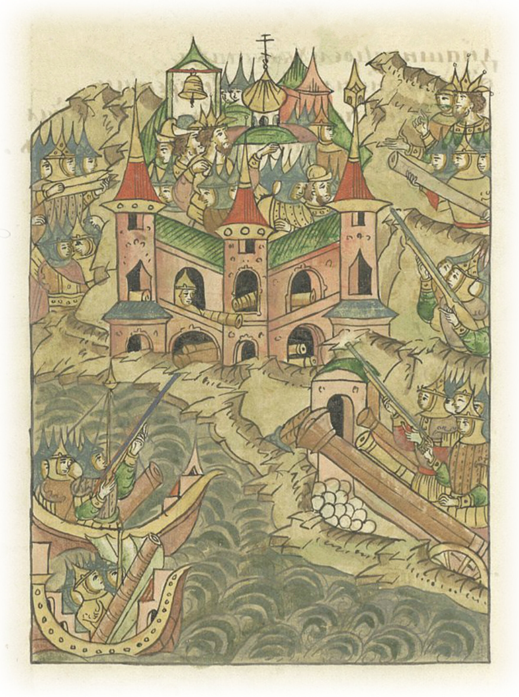 Языки говорят воеводам царя Ивана Васильевича, что магистр окопался большим рвом вокруг города Рындола, бьет из пушек и пищалей и приступает к Рындолу.