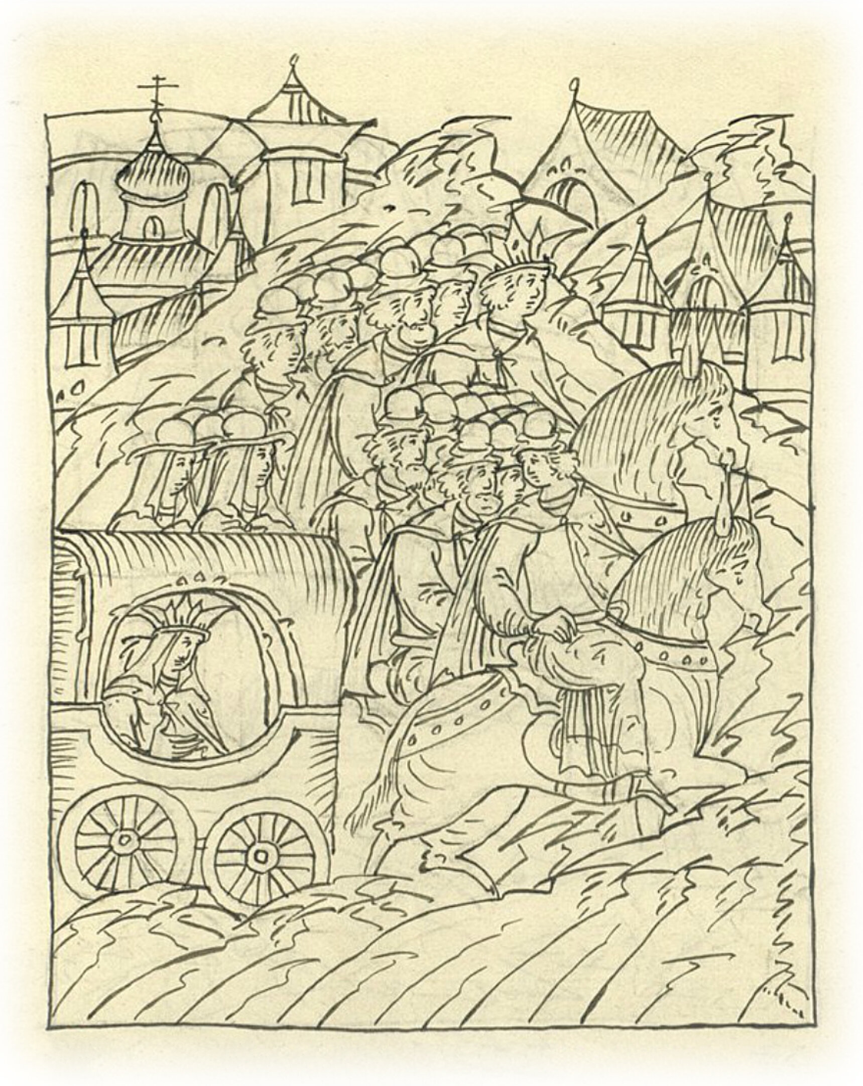 Царь Иван Васильевич едет из Сергиева монастыря с царицей Анастасией на царскую охоту в Слободу и Дмитров.