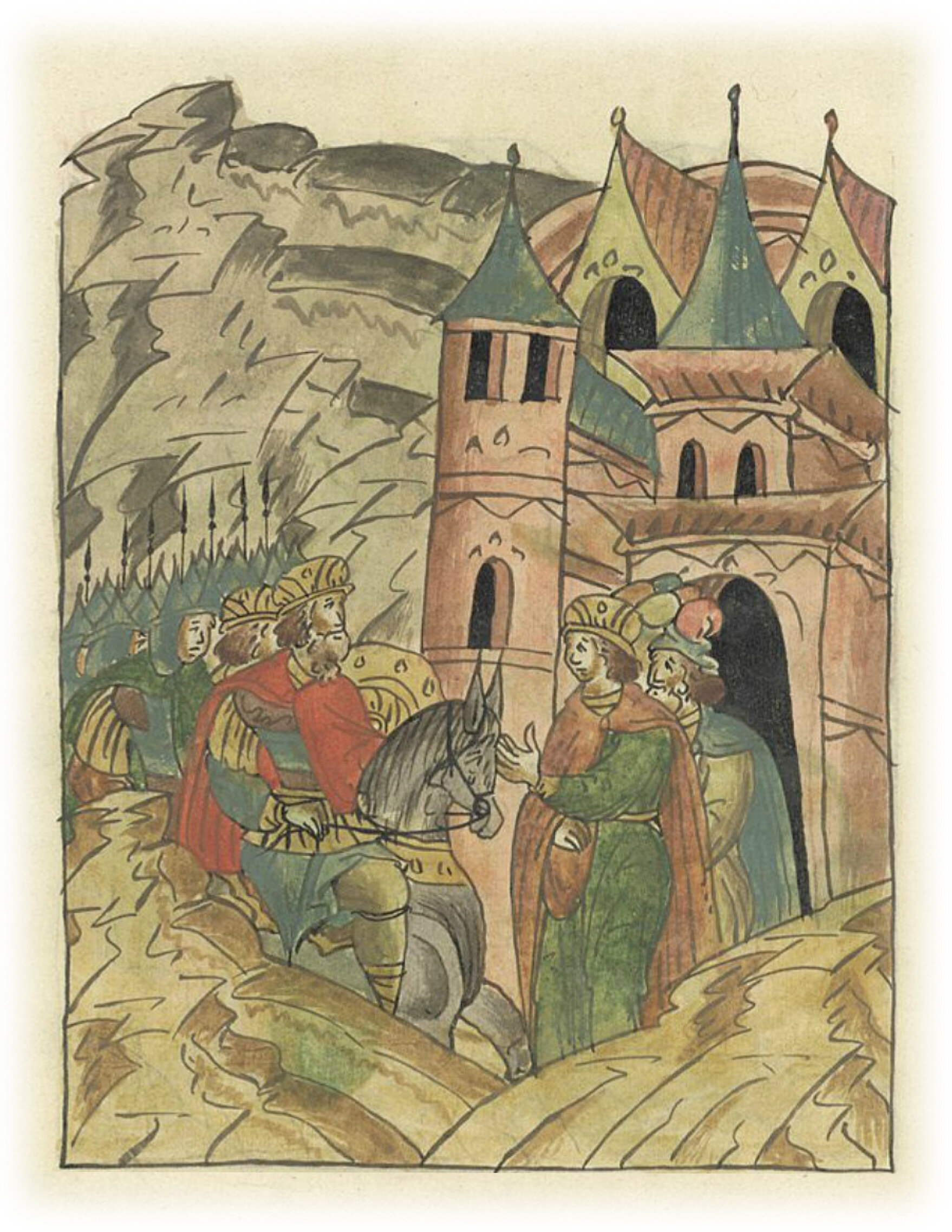 и, придя, встал у города. И князь Ярослав, сын его, вышел из города навстречу отцу своему. Пришли и рязанцы с безумными речами, по своему обычаю и непокорству.