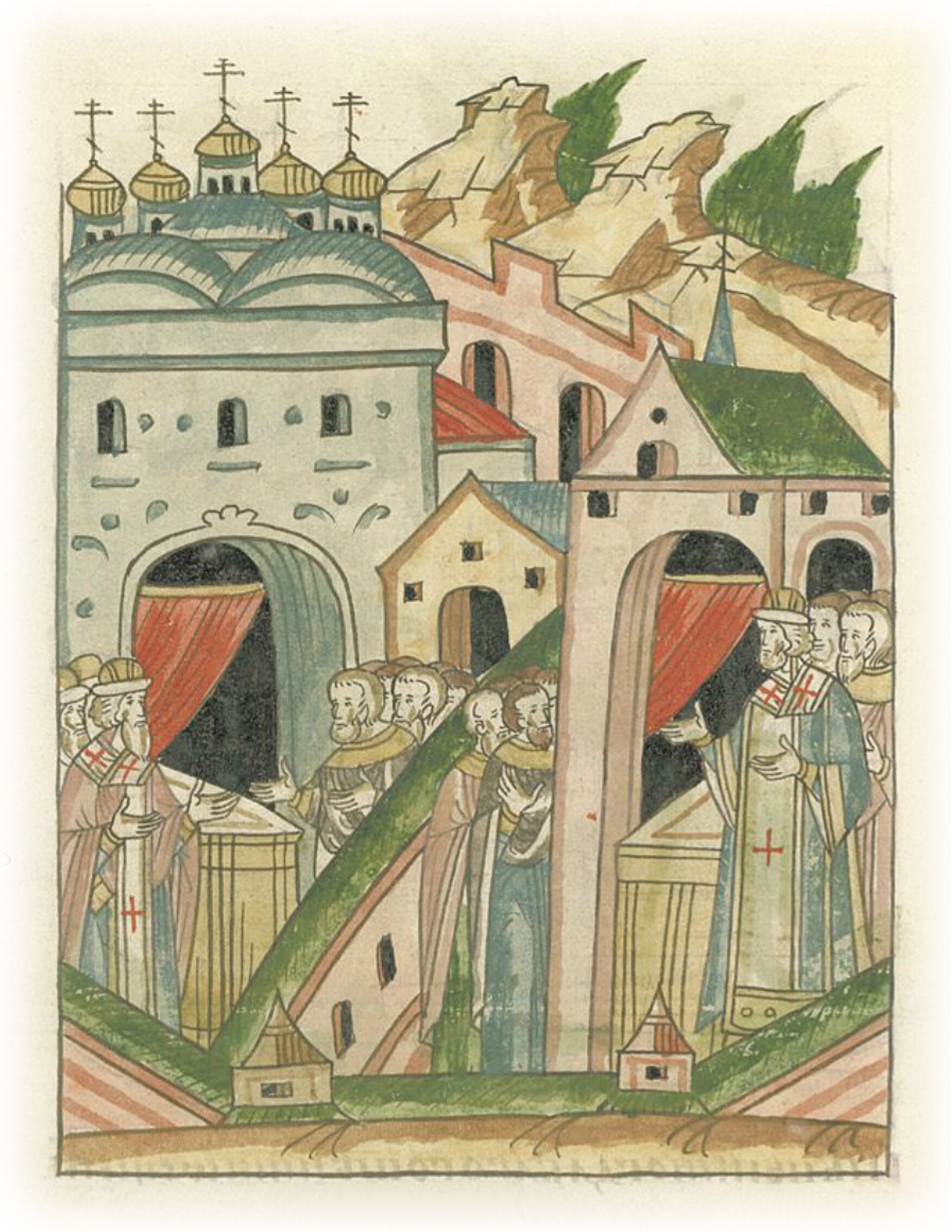 Когда же пришло время литургии, тогда митрополит сам служил в (своей) палате, в церкви Ризоположения на своем дворе, а епископам и всем священникам повелел служить в Архангельском соборе.