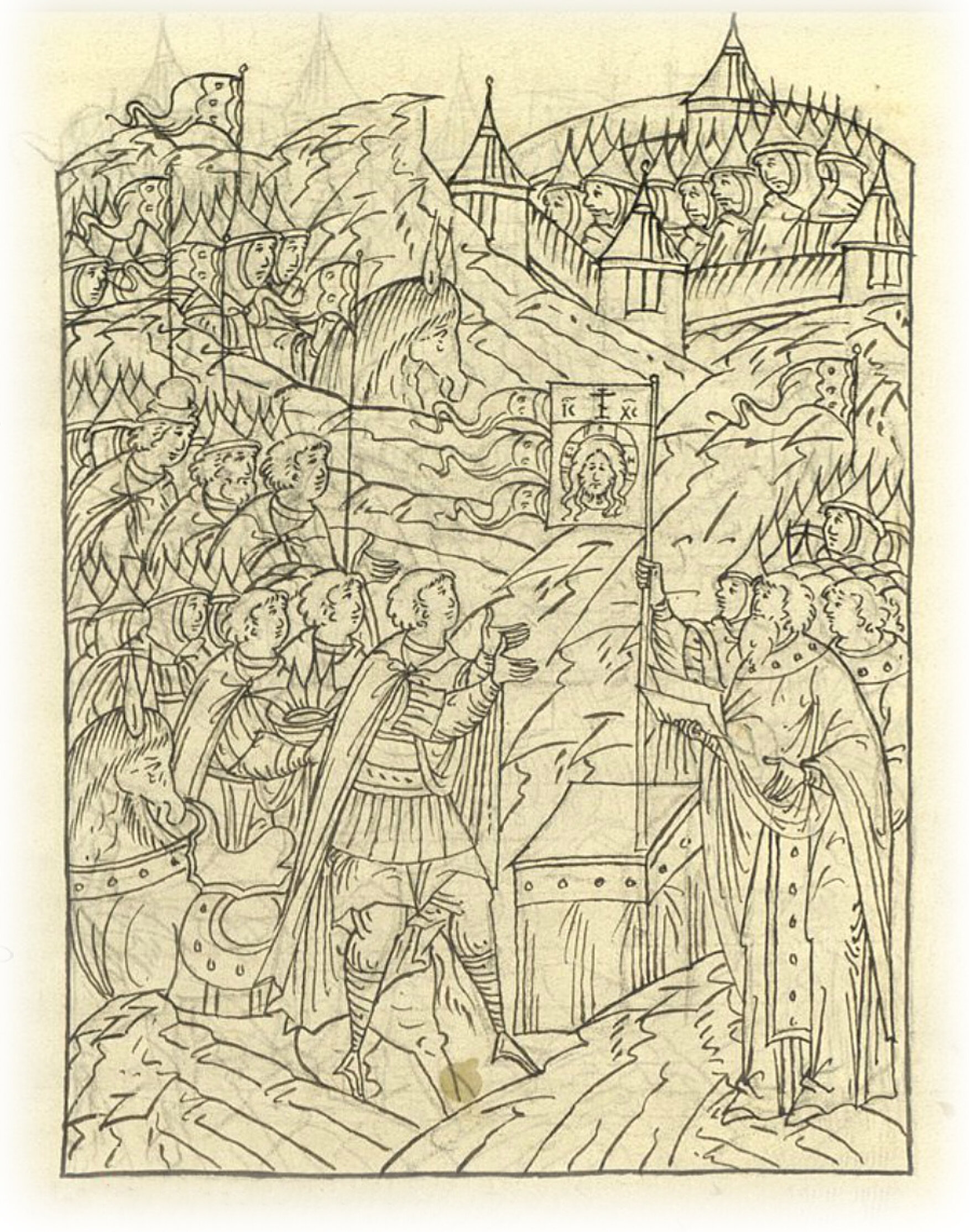 и велел начать молебен. А сам государь и князь Владимир Андреевич, и все бояре и воеводы сошли с коней; и начали молебен петь пречистому образу Спасову и честному кресту на исход ратных. Речь царская к князю Владимиру. Когда благочестивый царь смотрел на знамя, на котором был образ Создателя и животворящий крест, непрестанно слезы проливал и молитвы Богу непрестанно воссылал.
