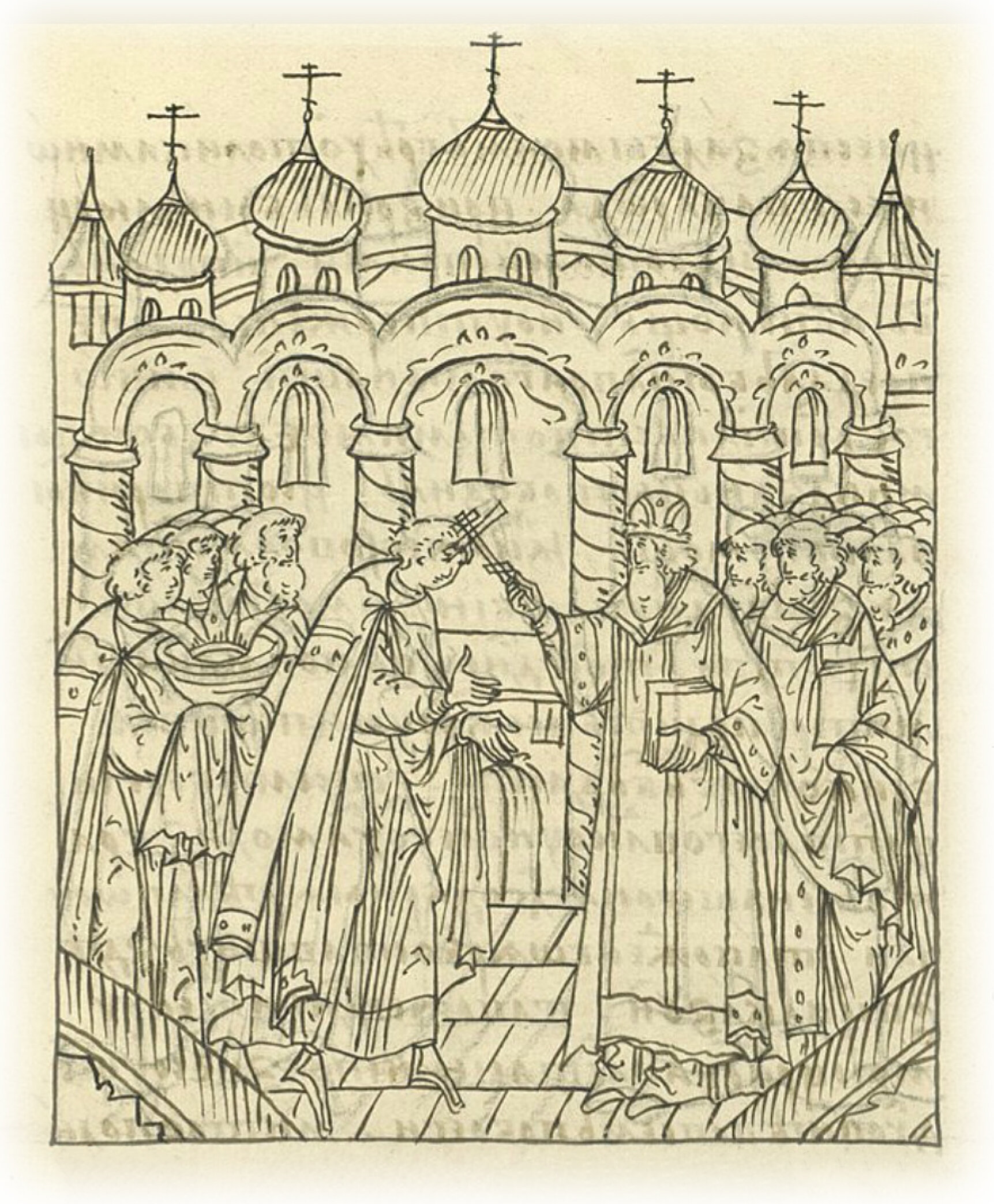 И благословляется у первосвятителя Макария, митрополита всея Руси, и говорит митрополиту и архиепископу, и епископам, и всему освященному собору: «Пожалуйте, господа, подвигнитесь в настоящее время на пост и на молитву и молите Создателя и Пречистую Его Богоматерь, и великих чудотворцев, чтобы Христос не прогневался на нас до конца и не помянул бы согрешения моей юности и невежество мое, и не связал бы по моим грехам такое множество народа, призрел бы людей Своих щедротами Своими и подал бы вам помощь и утверждение, и не предал бы нас нашим врагам и многое христианство, томимое безбожными казанцами, освободил и сотворил бы нам помощь по Его святой воле. А я вам, господа, челом бью и молю ваше святительство. Ты же, господин отец мой, Макарий, митрополит всея Руси, постарайся, сколько тебе Бог даст, молить Владыку нашего Христа во всем защитить царство наше; брата же нашего на благодарные дела поучай, также и бояр, оставшихся здесь, во всем поучай; также, господин, и жену мою, царицу Анастасию, беременную, духовно во всем побереги». Митрополит же и владыки государю со слезами говорят: «Подобает тебе за порученное стадо стоять мужественно и данный тебе талант умножить, чтобы не назвали тебя наемником, но истинным пастырем, который душу свою отдает за овцу; но только, царь, нас, сирых, на кого ты оставляешь? Добрый пастырь, свет очей наших, куда идешь?» Государь же им говорил: «На Пречистую упование и надежду все возлагаем, да на ваши святые молитвы уповаю: просите и возьмите». Митрополит же благословил государя крестом животворящим и сказал: «Благодать Святого Духа да будет с тобой, царем православным, и со всем твоим христолюбивым воинством».