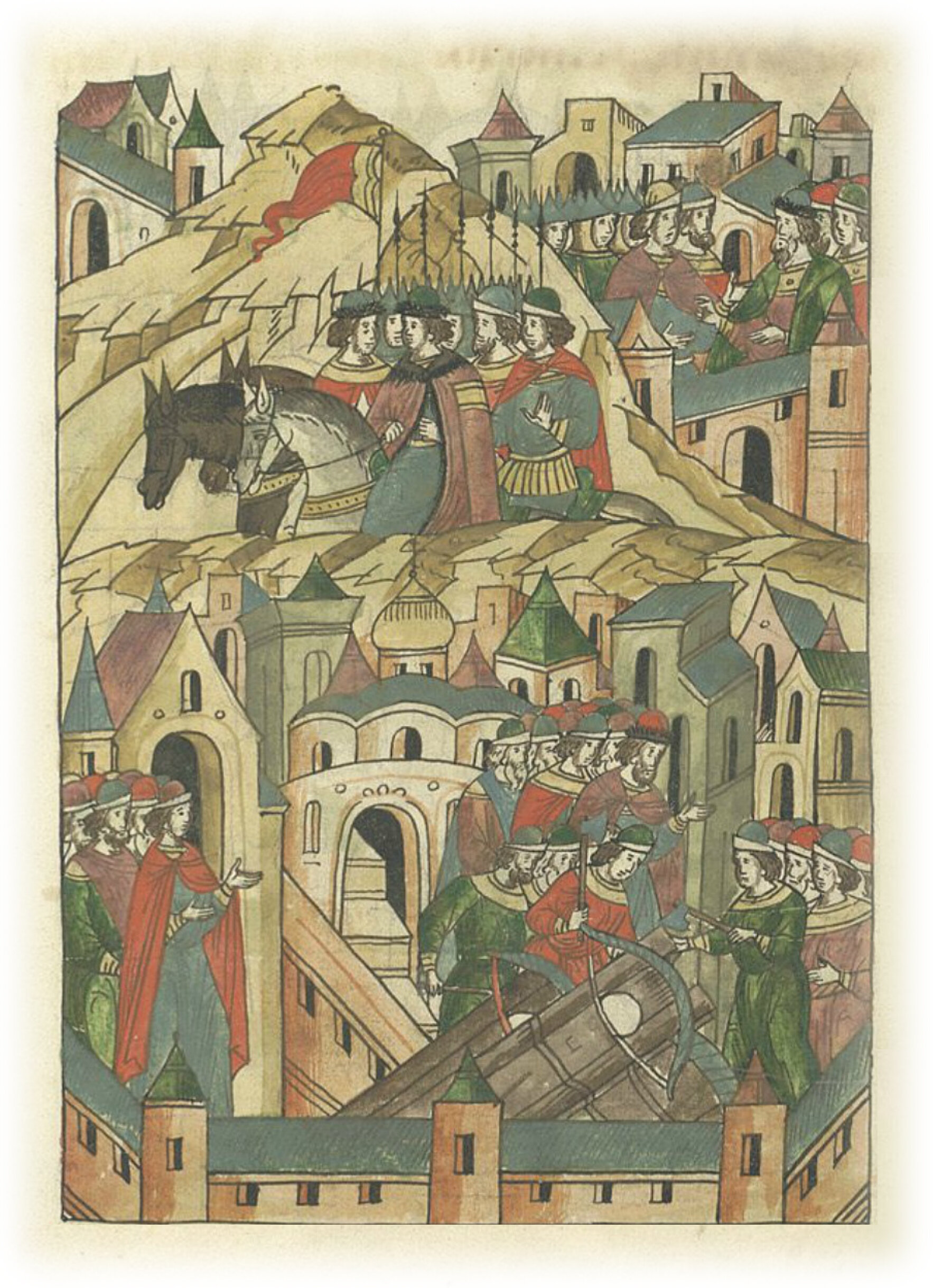 Он же послал к ним в Новгород вместо себя сыновей своих, Святослава и Михаила, и иных князей; и начали готовить осадные орудия на Владычном дворе.