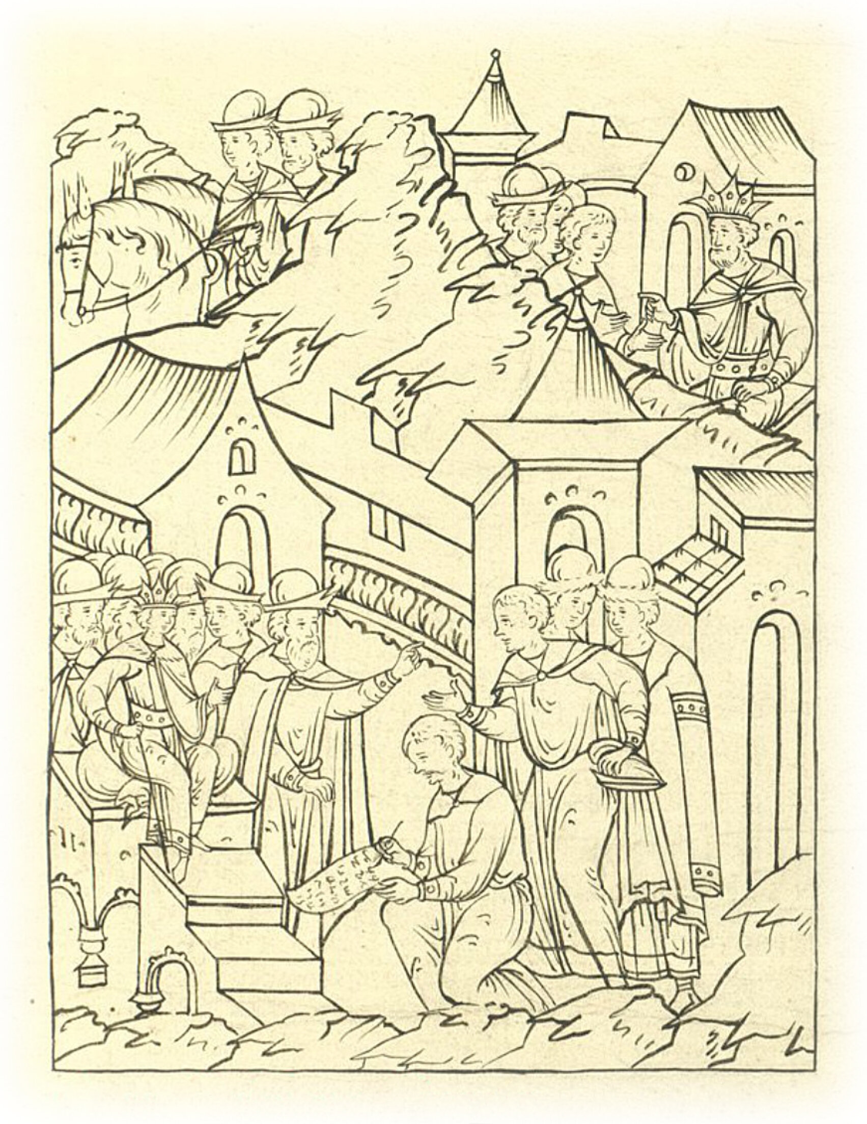 Казанские послы от царя Яналея приходят к великому князю Ивану Васильевичу с грамотой о мирном договоре.