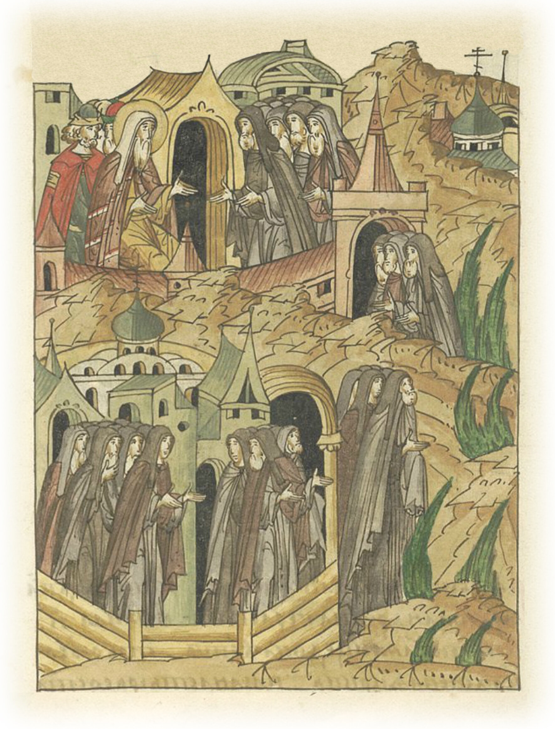 Повесть о преподобном Сергии Радонежском. Братья из монастыря святой Троицы в Радонеже молят митрополита Алексея, чтобы он возвратил им из Кержача в Радонеж преподобного игумена Сергия.
