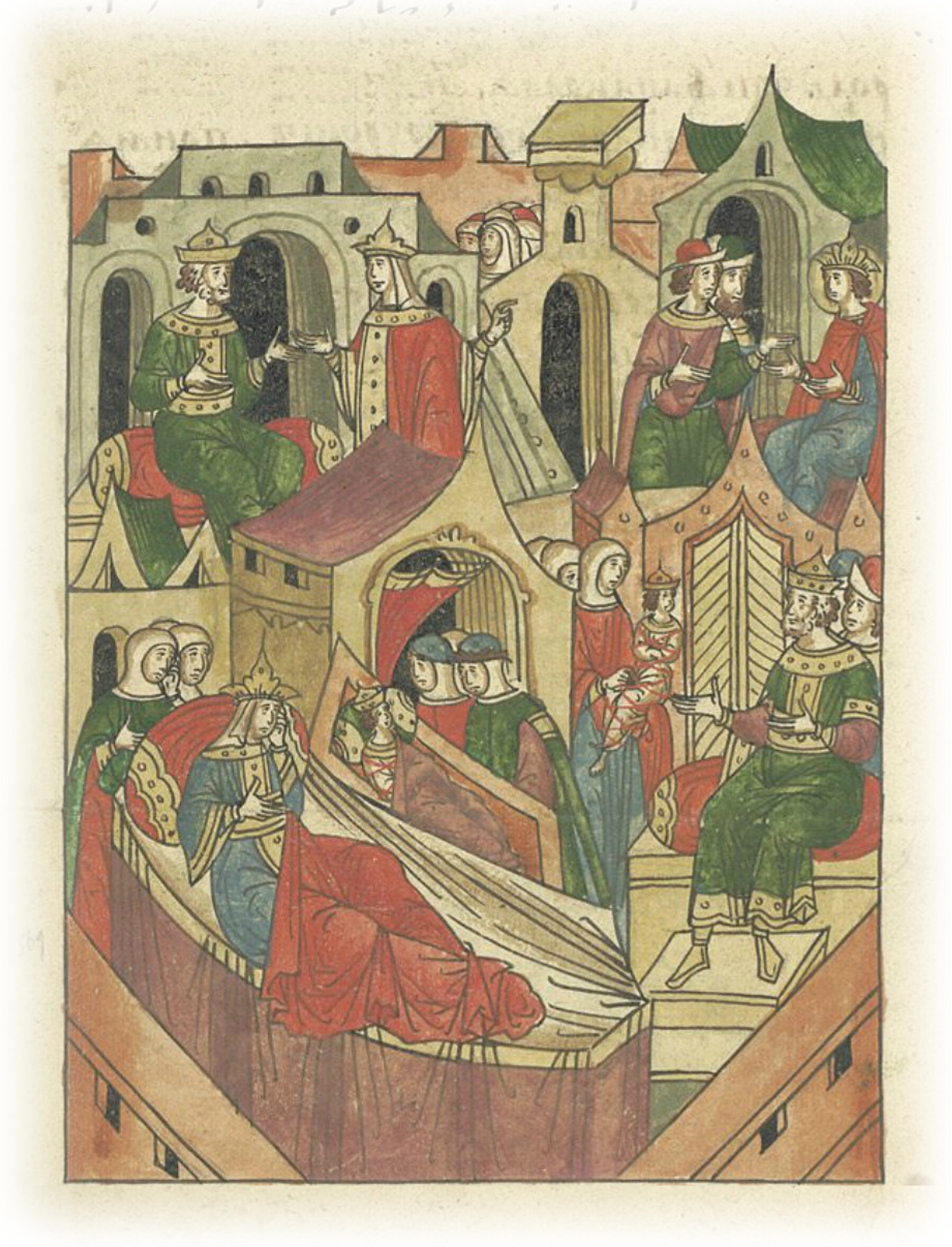 И после смерти матери Стефановой король Милутин приобщается ко второму браку: у греческого царя Андронника Палеолога дочь взял. И родил от нее сына Константина. Царица же, видя Стефана всеми любимого, ненавидела его; но приходит ко отцу его, слезы испуская и со скорбным лицом, словно о спасении его помышляет, и клевещет на праведного, что к ней любовно устремляется и на отца своего недоброе замышляет.