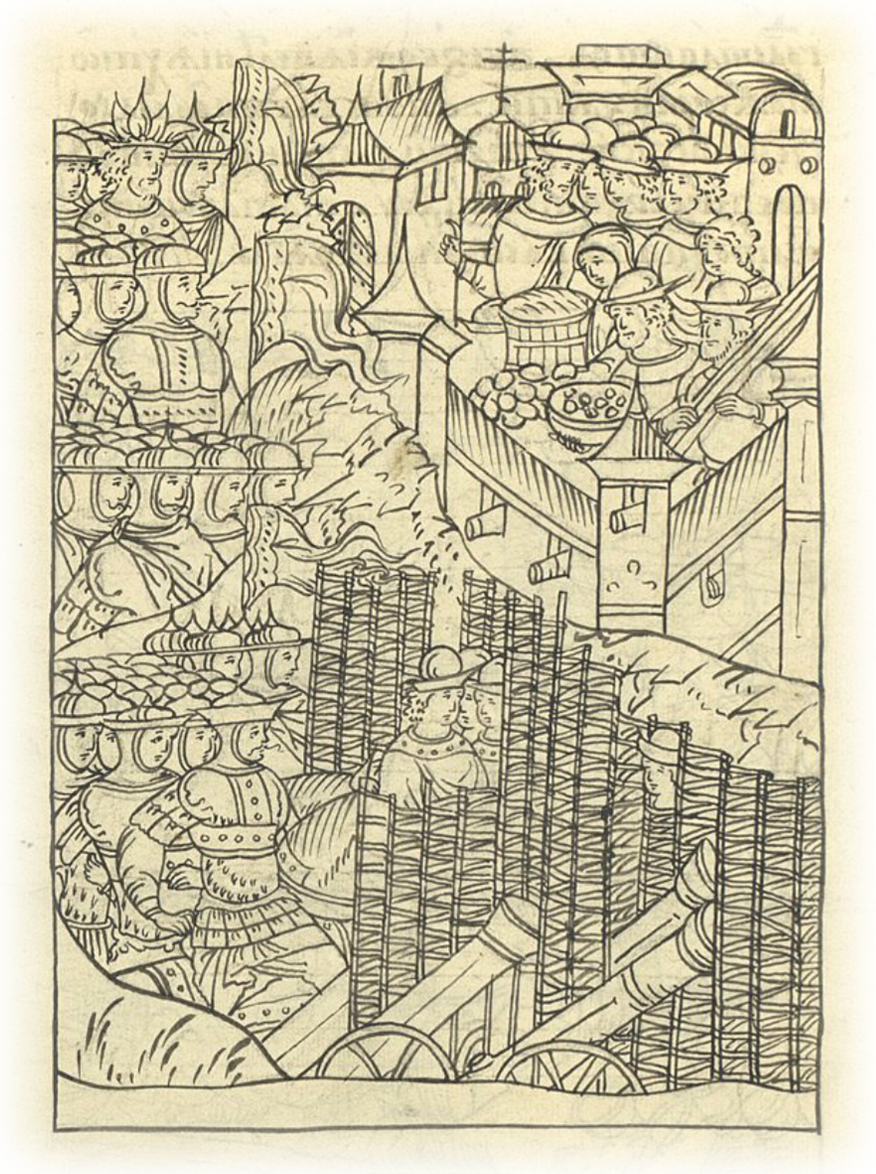 Языки говорят воеводам царя Ивана Васильевича, что магистр окопался большим рвом вокруг города Рындола, бьет из пушек и пищалей и приступает к Рындолу.