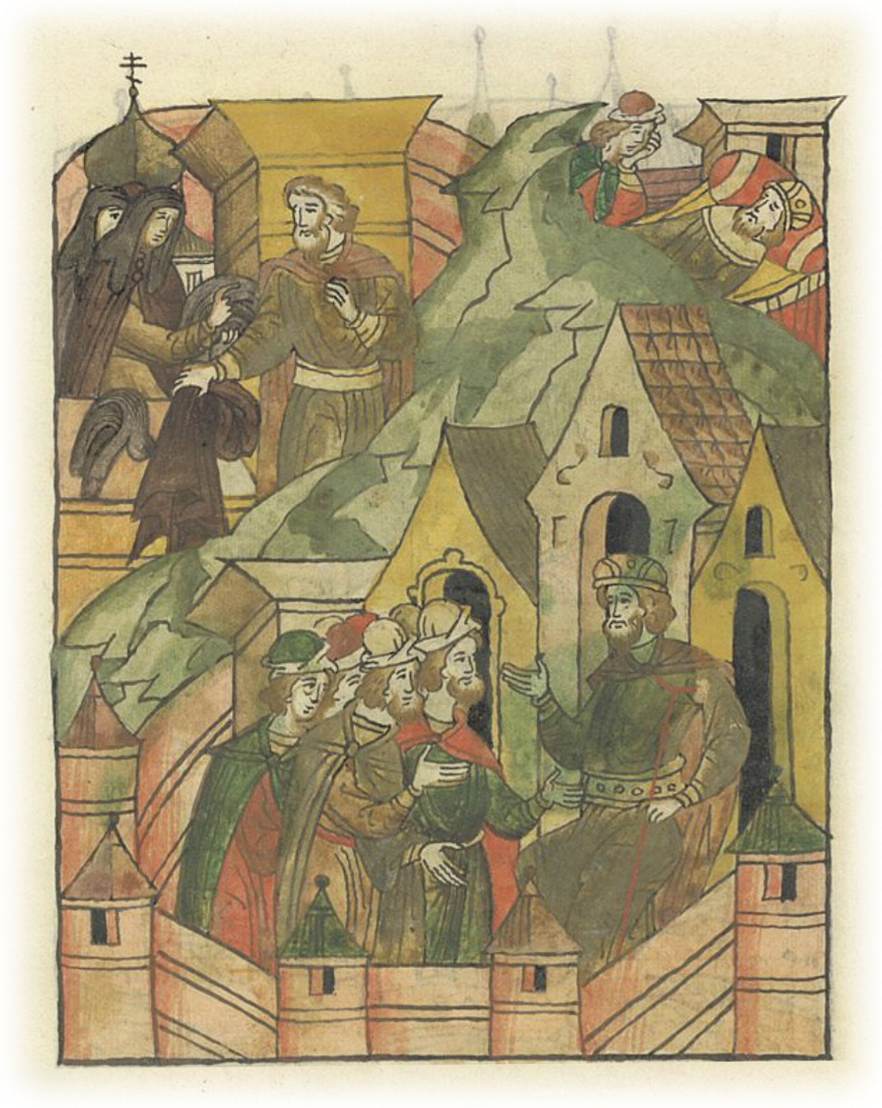 Ругодивские посадники Яким и Захар приезжают в Москву. Воеводы царя Ивана Васильевича Алексей Адашев и Иван Михайлов сообщают им, что государь пожалует их, если сдадут его воеводам помимо Ругодива Вышгород.