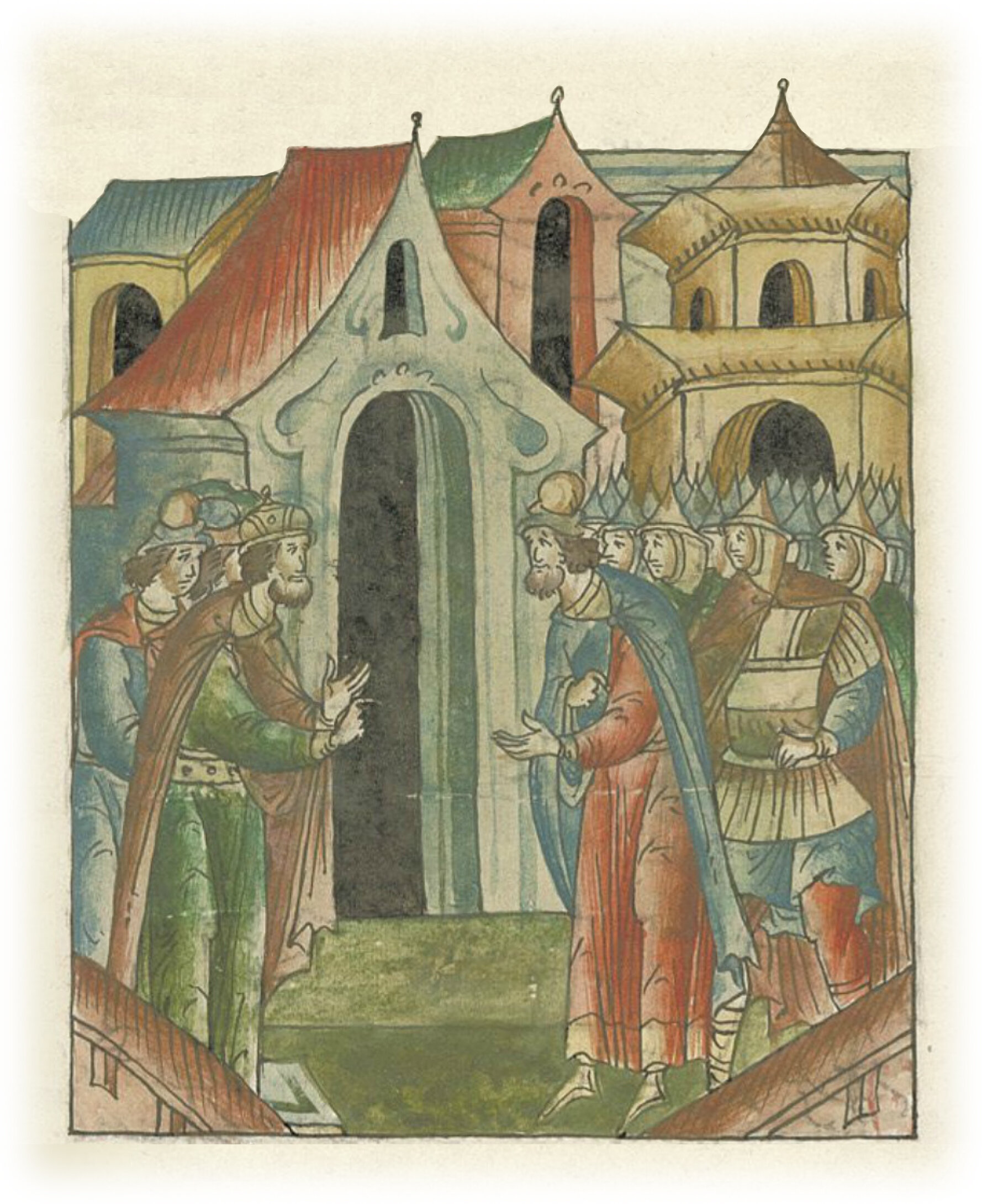 Ругодивские посадники Яким и Захар приезжают в Москву. Воеводы царя Ивана Васильевича Алексей Адашев и Иван Михайлов сообщают им, что государь пожалует их, если сдадут его воеводам помимо Ругодива Вышгород.