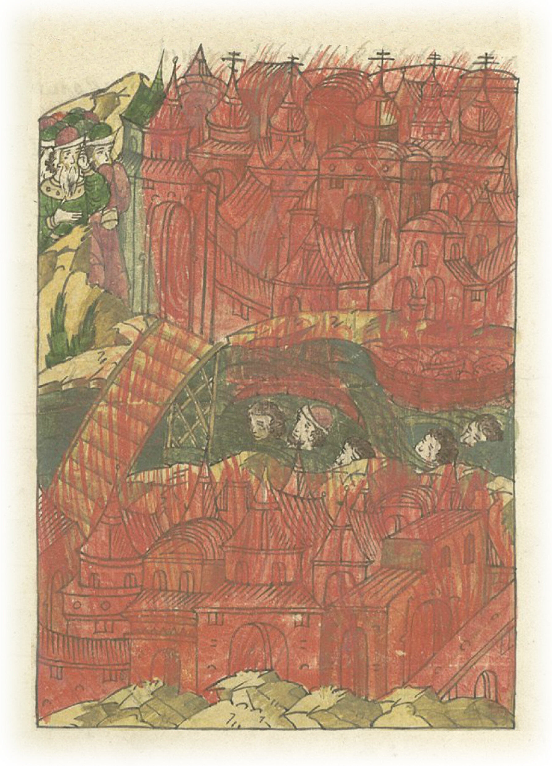 В том году погорел Новгород Великий, и такая огненная ярость была, что огонь ходил по воде с бурей и вихрем, и много людей утонуло в Волхове. И перекинулся огонь на другую сторону через Волхов, и та сторона вся погорела, и все церкви и деревянные, и каменные.