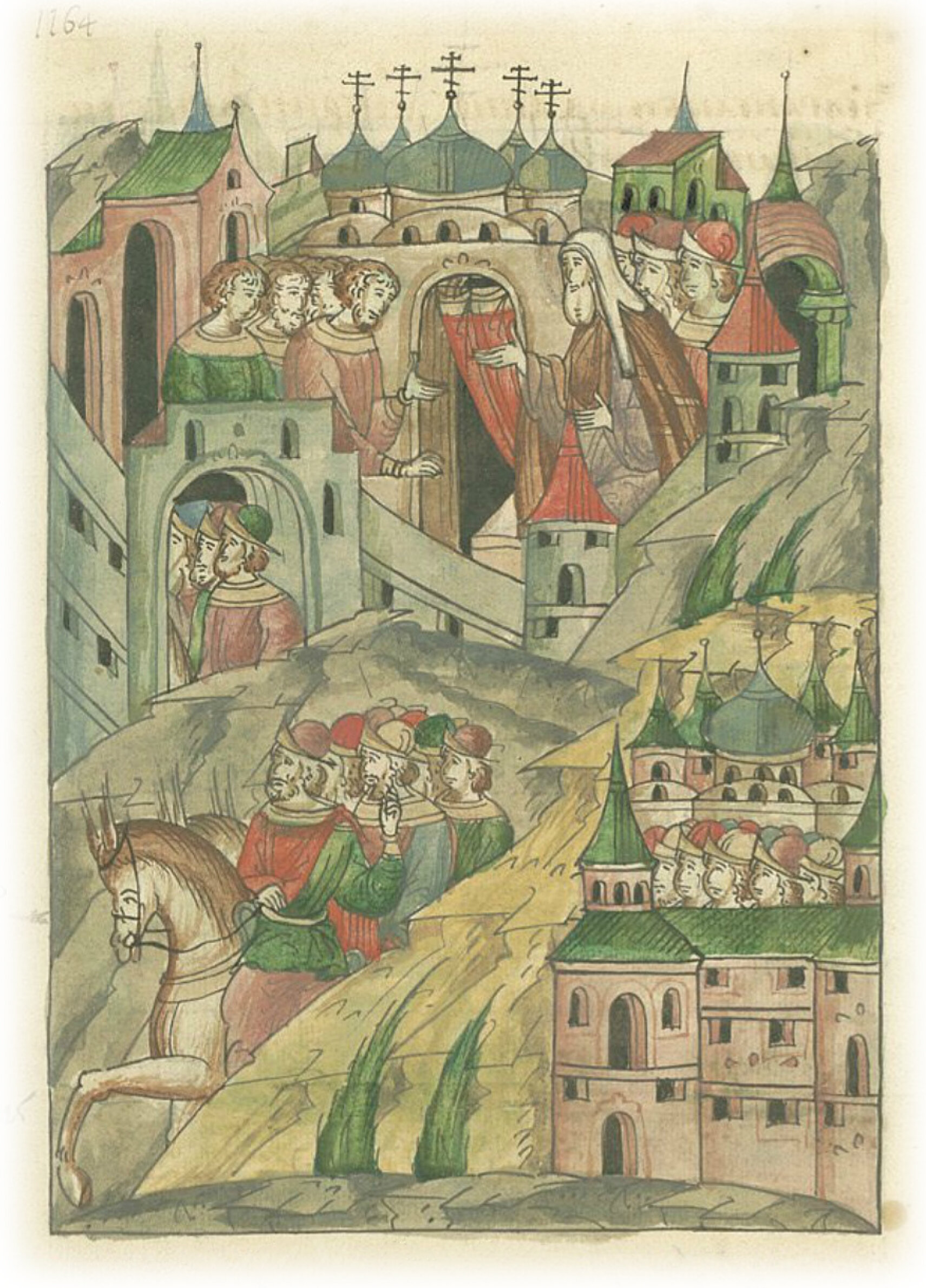 Псковские послы просят Новгородского архиепископа Ивана примирить псковичей с новгородцами.