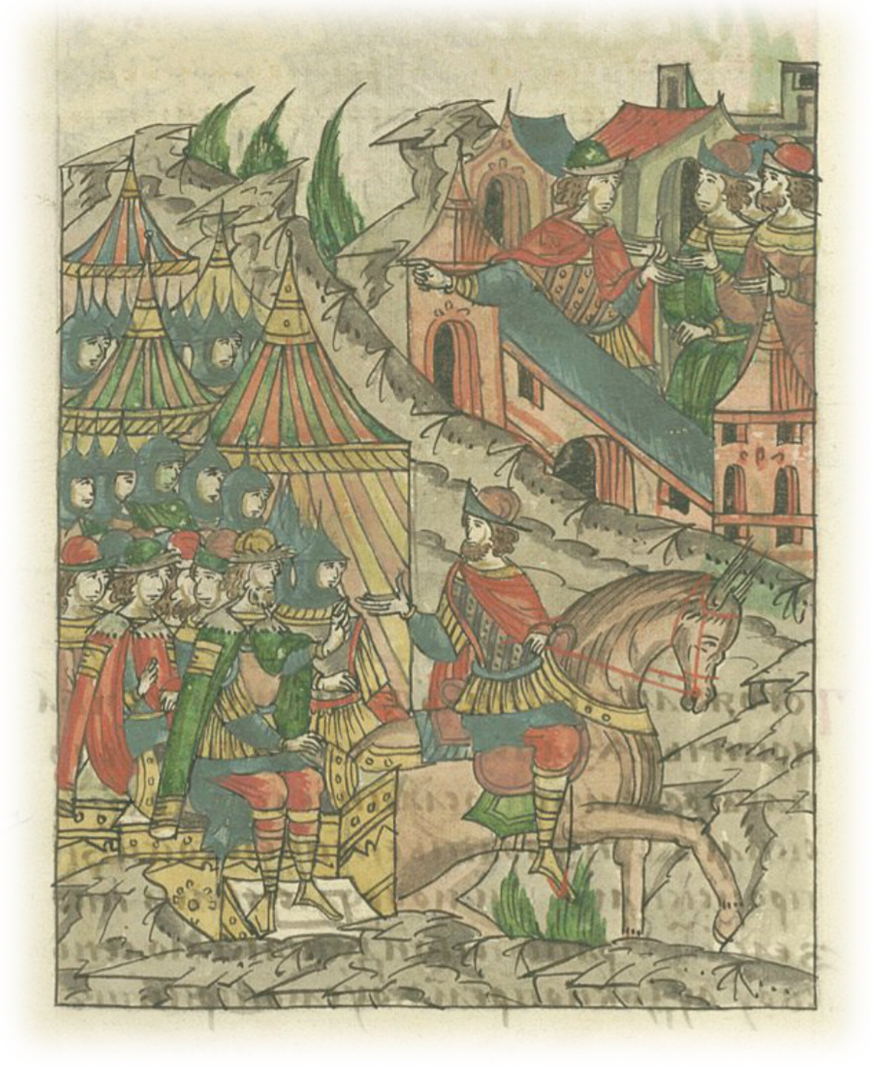 Подойдя с войском к Смоленску, великий князь Олег Иванович посылает посла в город, требуя открыть ворота и принять великого князя Юрия Святославича Смоленского на княжение.