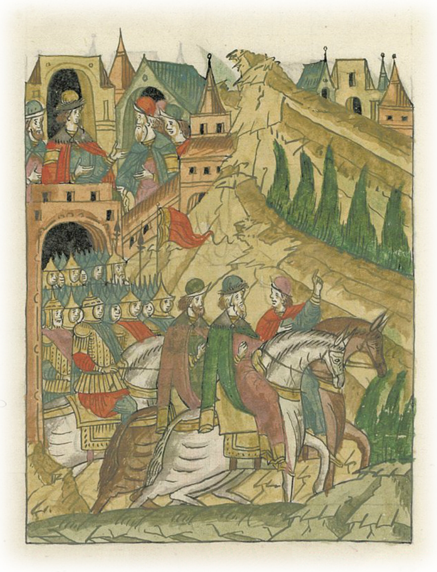 Ругодивские посадники Яким и Захар приезжают в Москву. Воеводы царя Ивана Васильевича Алексей Адашев и Иван Михайлов сообщают им, что государь пожалует их, если сдадут его воеводам помимо Ругодива Вышгород.