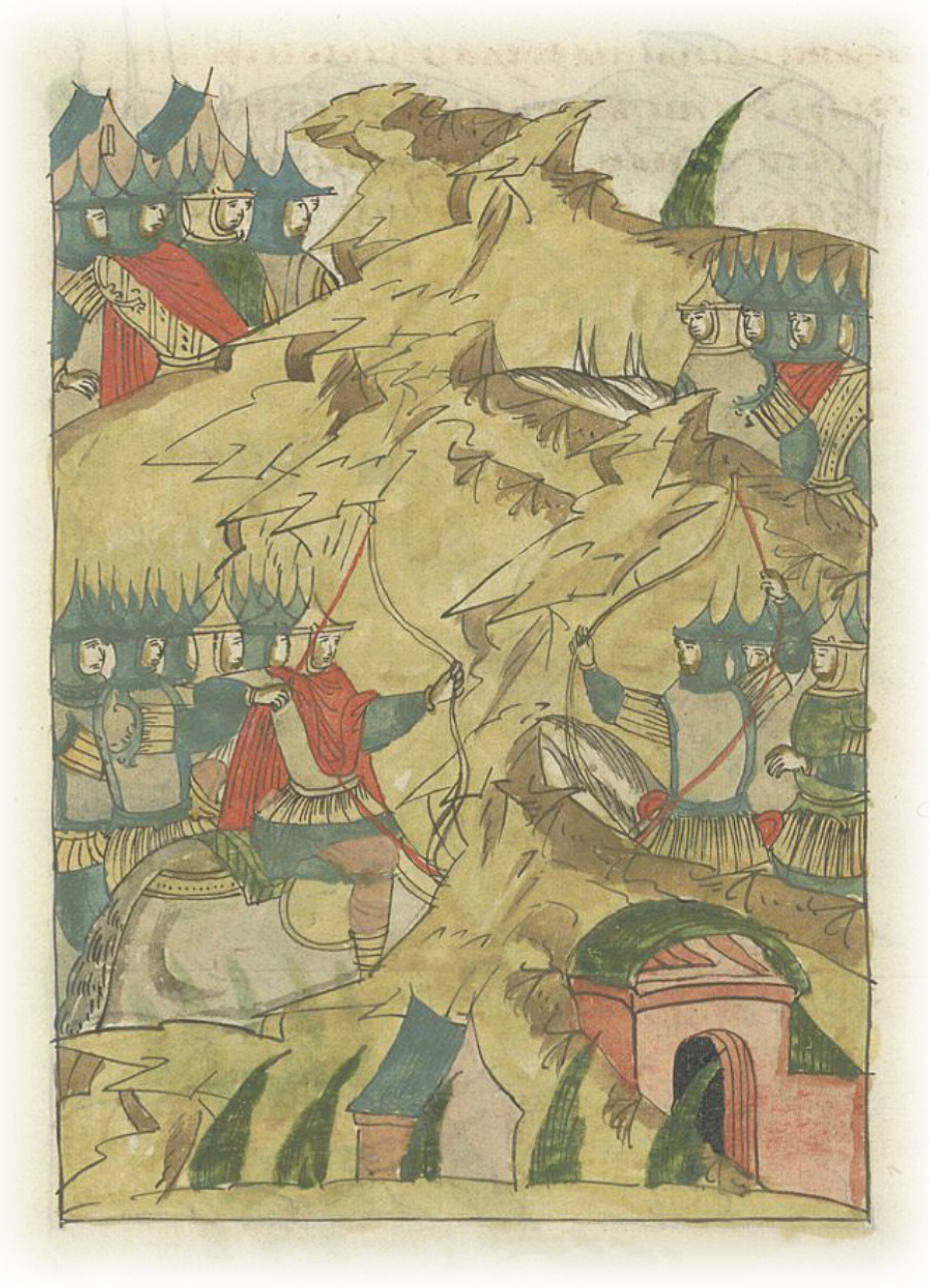 Они же оттуда пошли все вместе со многими людьми, и пришли в Ельню, и тут встретились им татары, и начали меж собой стреляться.
