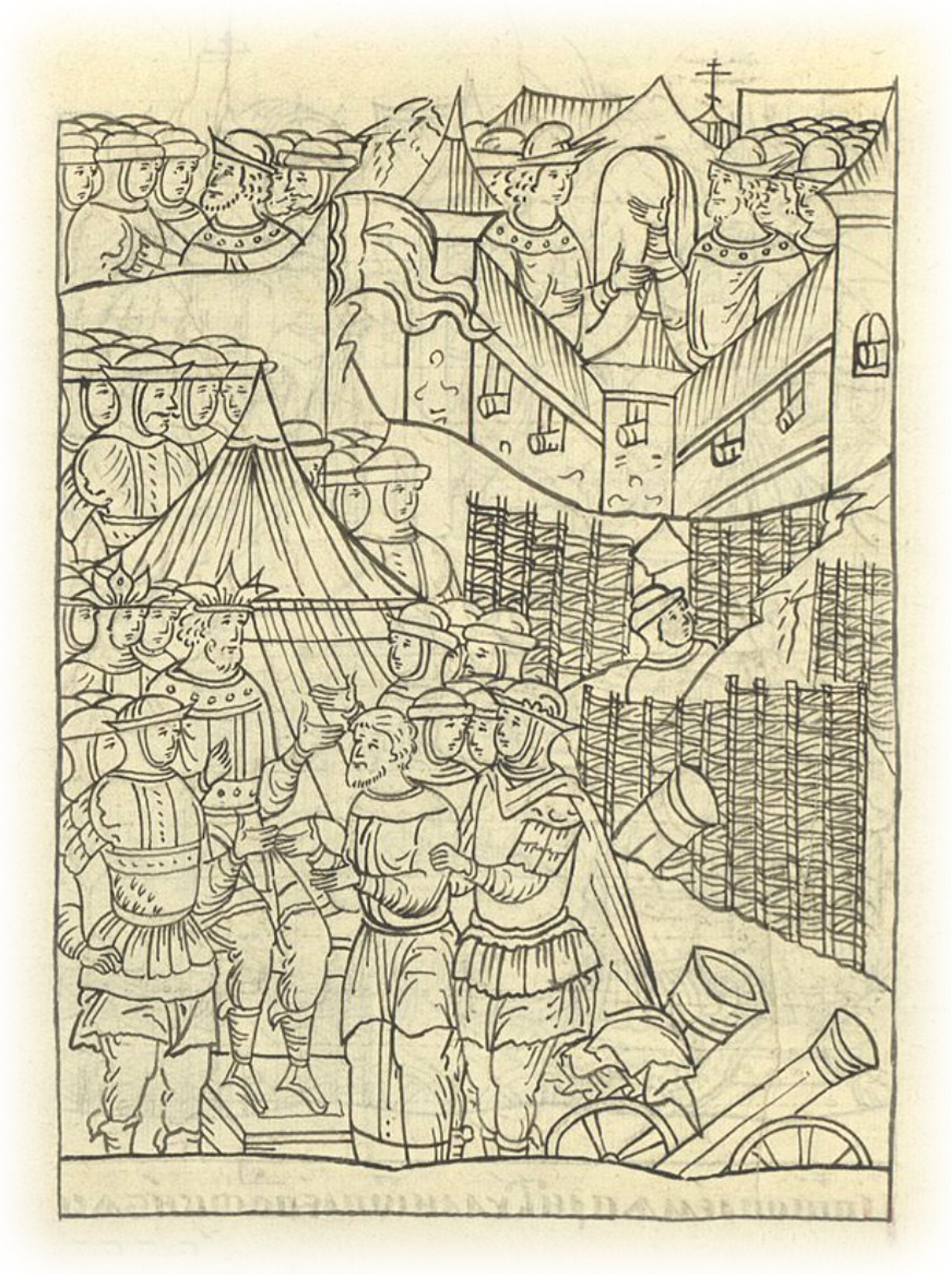 Языки говорят воеводам царя Ивана Васильевича, что магистр окопался большим рвом вокруг города Рындола, бьет из пушек и пищалей и приступает к Рындолу.