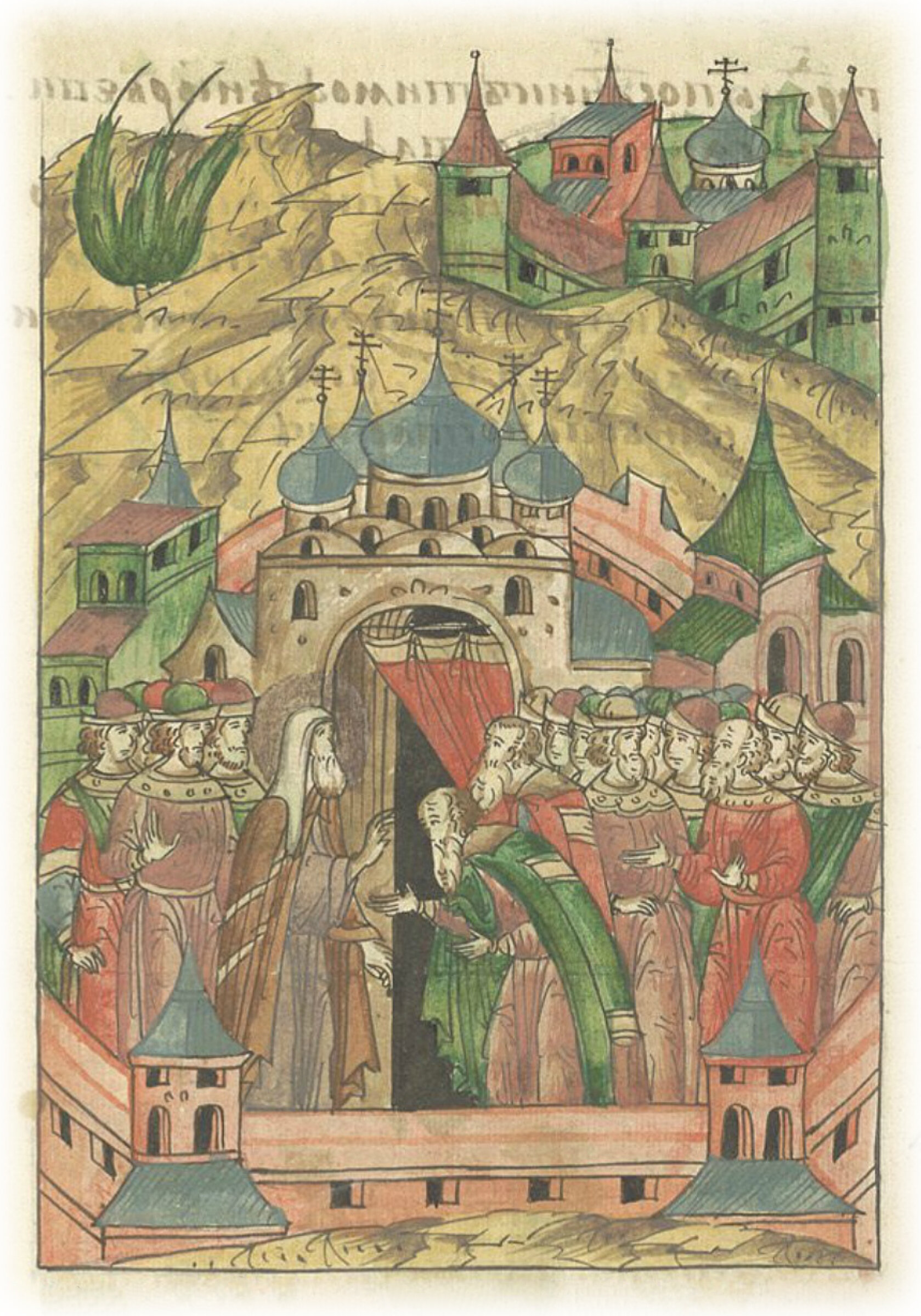 Новгородцы принимают благословение своего владыки Ивана и устанавливают мир со псковичами.
