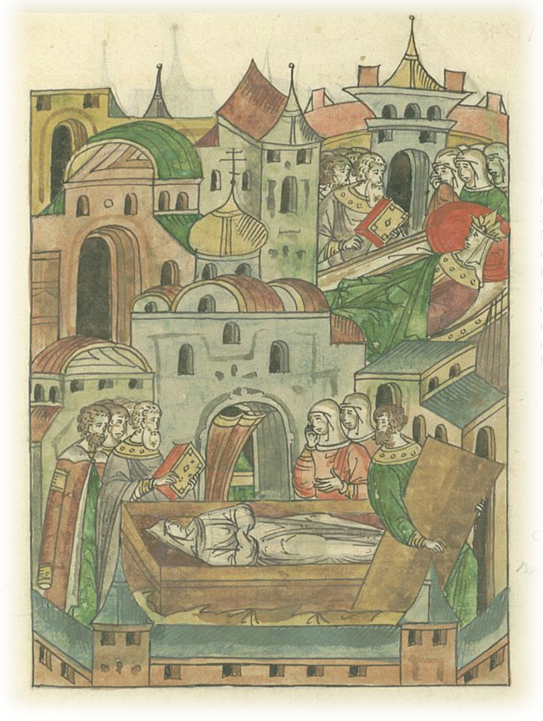Кончина великой княгини Авдотьи, жены великого князя Ивана Михайловича Тверского, и ее похороны в соборной церкви Преображения Господня в Твери.
