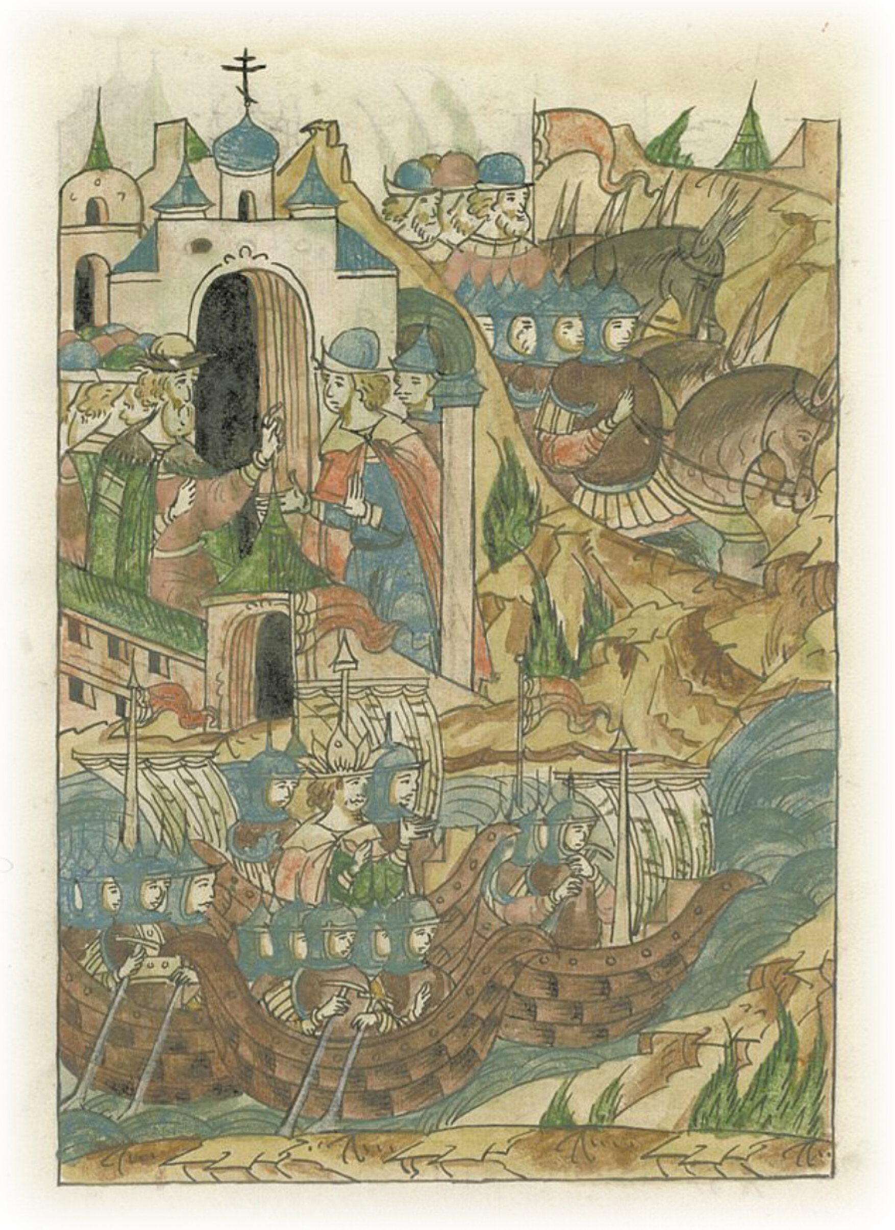 А отправил под Казань царя Шигалея по Волге в судовой рати и с ним воевод своих, а также и Полем конную рать со многими людьми, и велел пленить казанские окрестности.