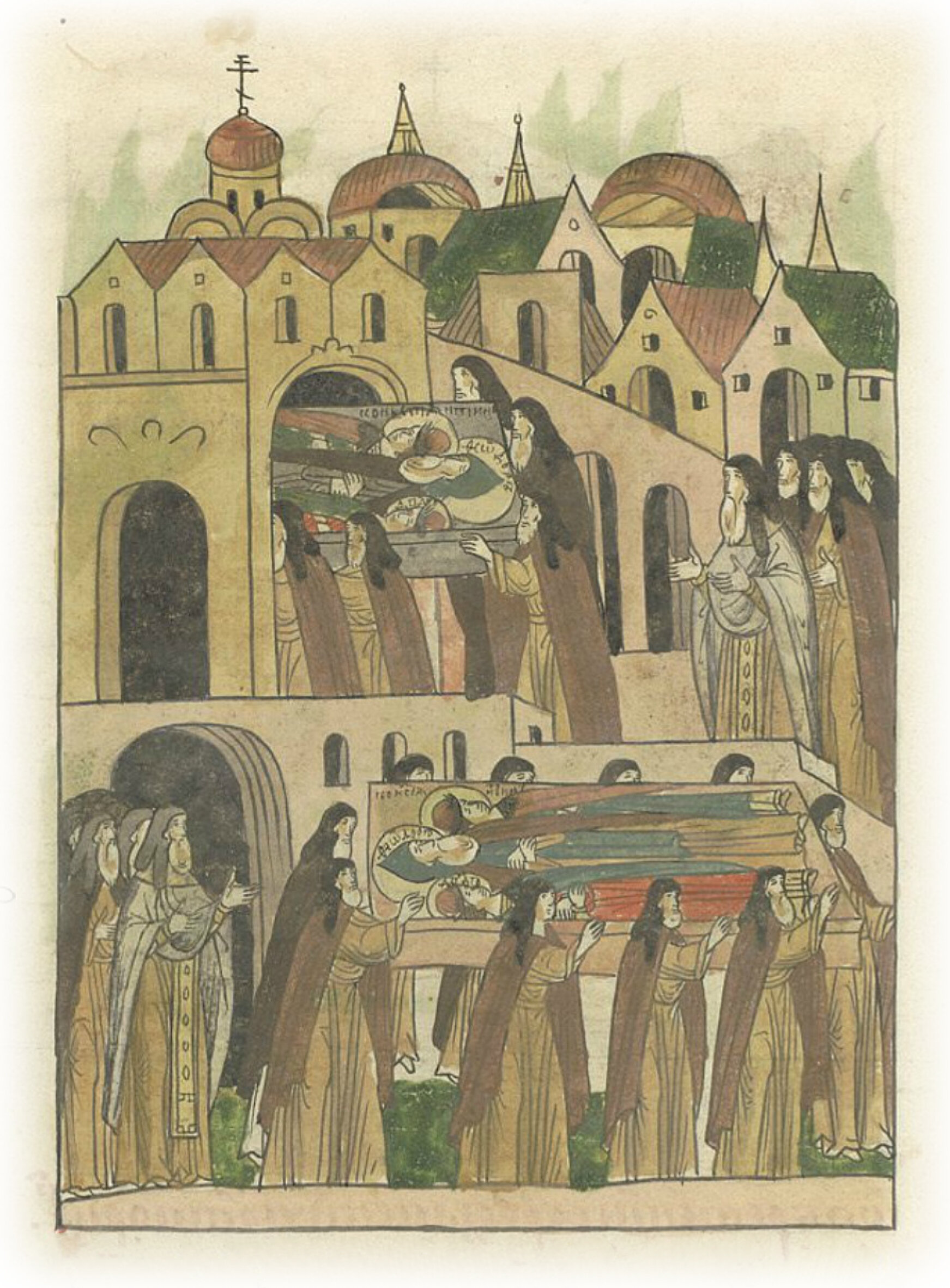 Архимандрит монастыря святого Спаса в Ярославле Христофор переносит обретенные мощи князя Федора Ростиславича и его сыновей Константина и Давыда в храм великого Спаса.