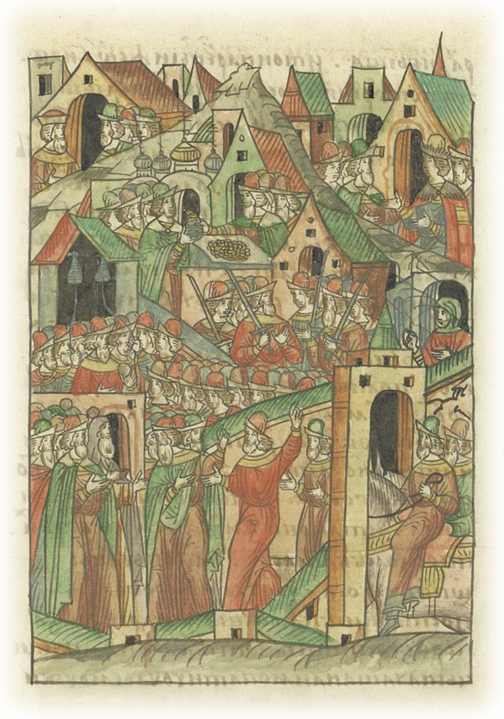 О смуте Новгородской и о возмущении их. Тот же их посол Никита Ларионов пришел к ним в Новгород и рассказал им о пожаловании великого князя. Множество бывших там лучших людей, посадники их и тысяцкие, и житейские* люди этому рады были и нареченный ими Феофил. Некоторые же из них, посадничьи дети, Исак Борецкий с матерью своей с Марфою и с прочими иными изменниками, наученные дьяволом, которые были хуже бесов, подстрекатели на погибель земли своей и себе на пагубу. Они начали говорить нелепое и лукавое и на вече пришли кричать: «Не хотим ни великого князя Московского, ни зваться отчиною его; мы вольные люди – Великий Новгород, а Московский великий князь многие обиды и неправду над нами чинит, и мы хотим короля Польского и великого князя Литовского Казимира». И так возмутился весь город, и восколебались как пьяные: одни хотели за великого князя по старине к Москве, а другие за короля к Литве. Те же изменники начали нанимать худых мужиков, которые на все готовы, по их обычаю, и пришли на вече, зазвонили во все колокола, и одни начали кричать: «За короля хотим!»; а иные кричали им: «За великого князя хотим Московского по старине, как было прежде сего!» Наймиты же изменников тех стали метать камни на тех, кто за великого князя хотел. И великая смута началась у них, и боролись между собой, сами на себя восставая. * люди, относящиеся к городским зажиточным сословиям, а также несущие службу при дворе князя или в уездных городах, боярские дети.