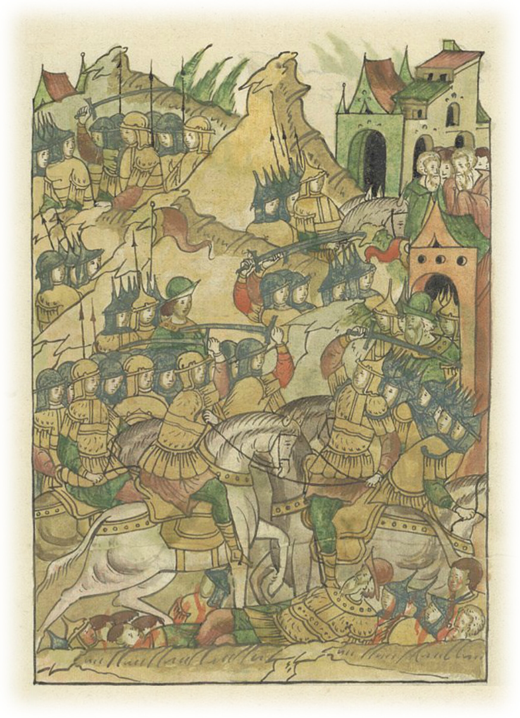 И пошел к Изборску весь город, и бились с немцами крепко, была меж ними сеча великая. Тогда же убили воеводу Гаврилу Гориславича, и побили псковичей, многих в погоне убили, а иных руками взяли, и преследовали до города,