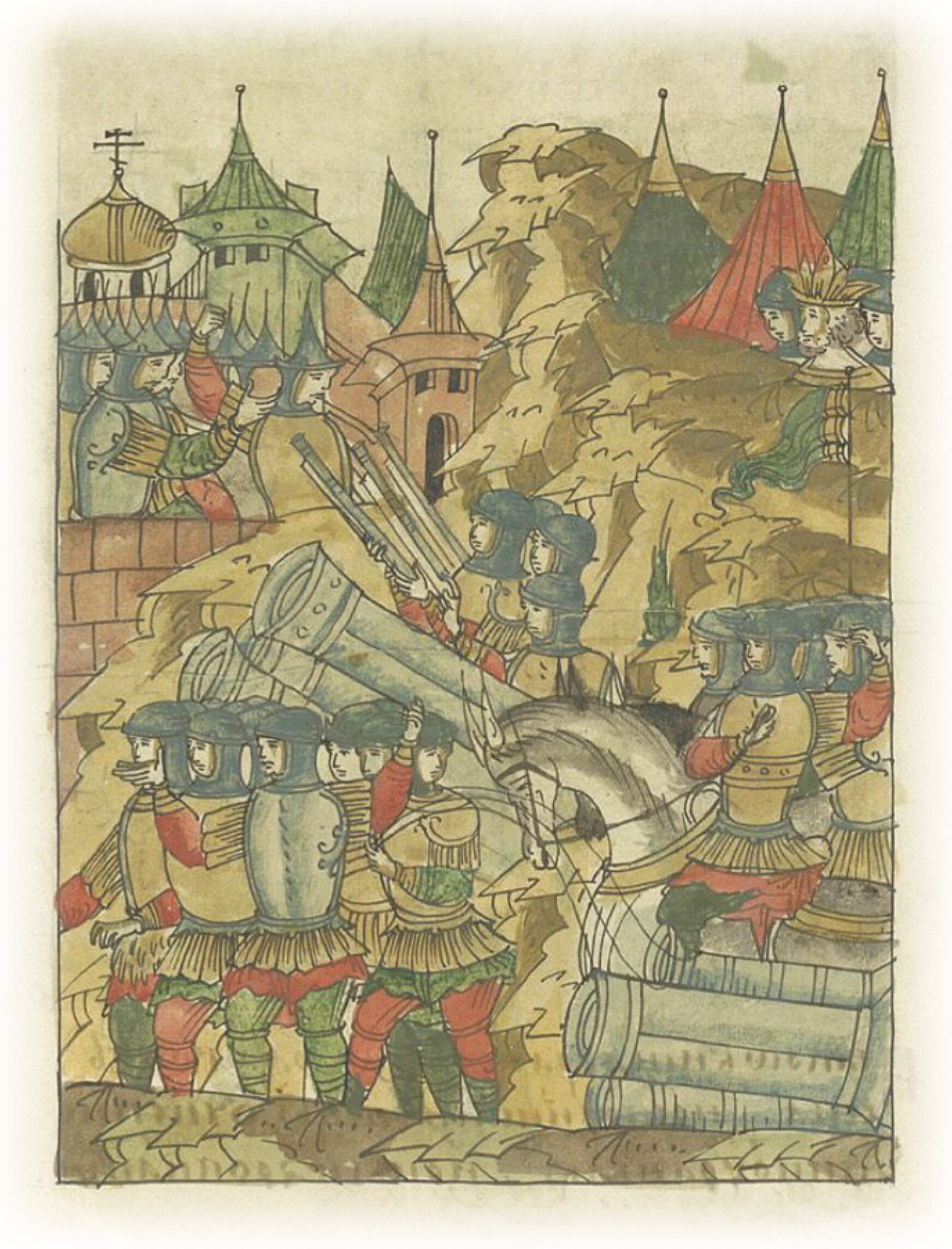Языки говорят воеводам царя Ивана Васильевича, что магистр окопался большим рвом вокруг города Рындола, бьет из пушек и пищалей и приступает к Рындолу.