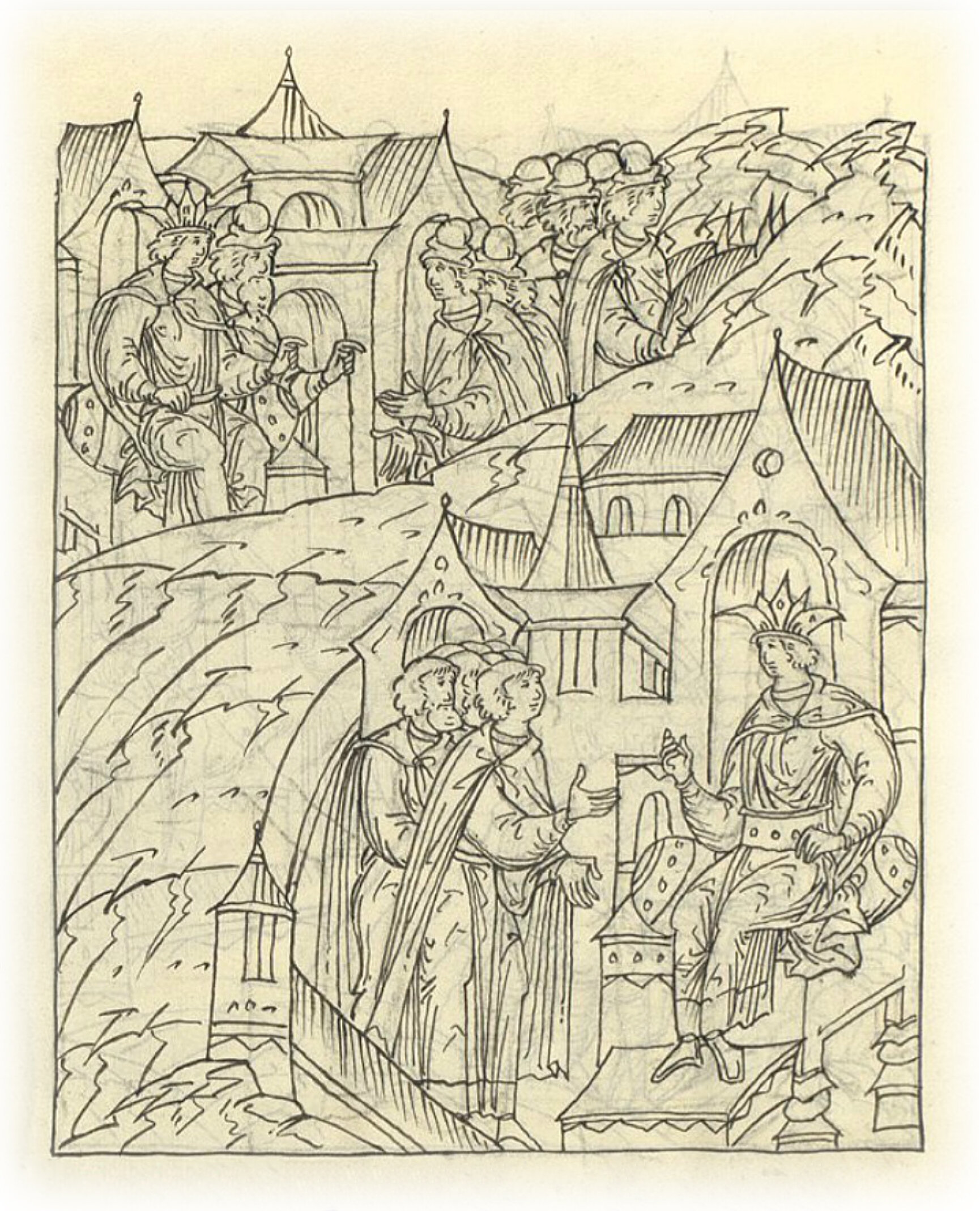 Ругодивские посадники Яким и Захар приезжают в Москву. Воеводы царя Ивана Васильевича Алексей Адашев и Иван Михайлов сообщают им, что государь пожалует их, если сдадут его воеводам помимо Ругодива Вышгород.