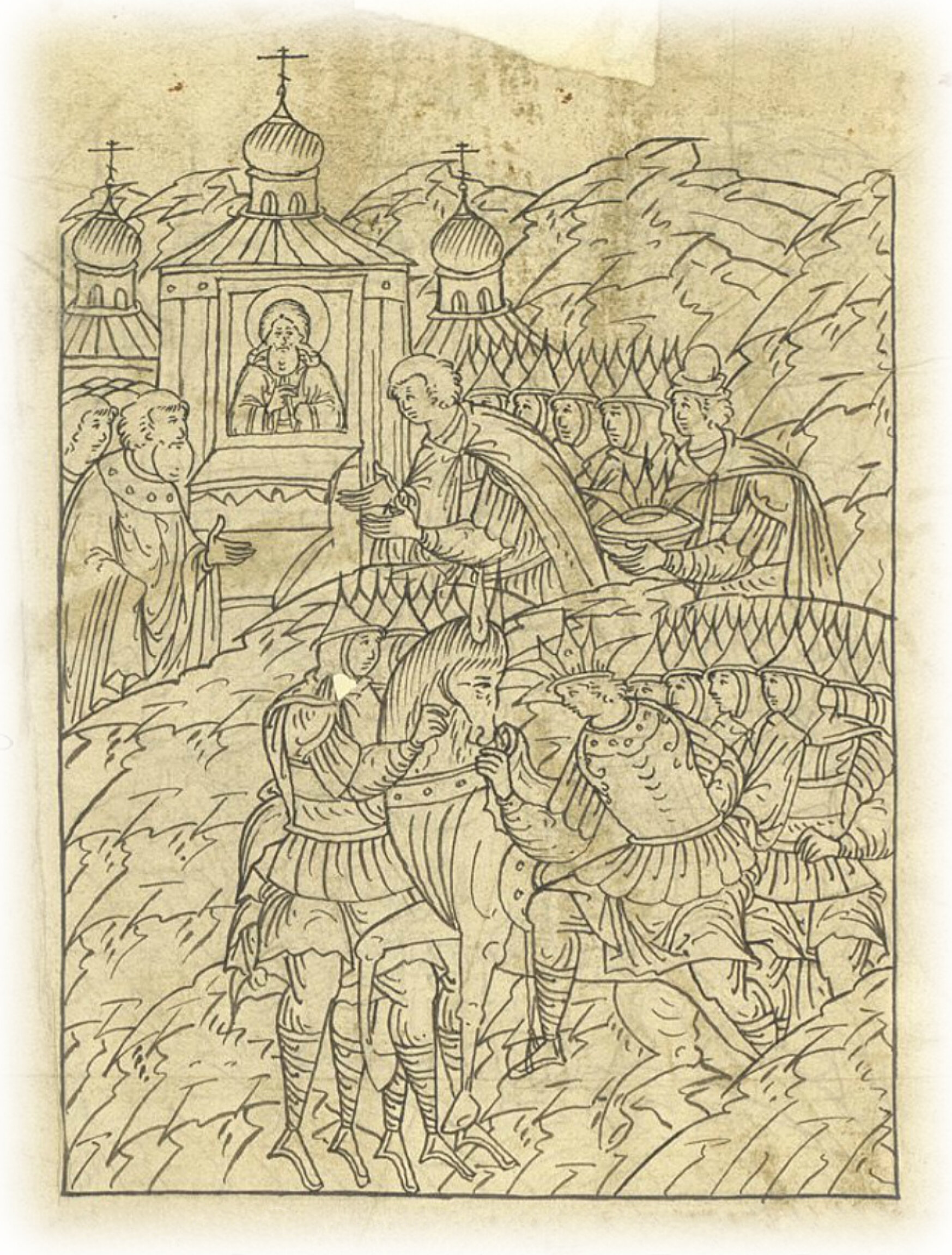 сошел государь с коня и пришел к чудотворцу Сергию и, молебен совершив,