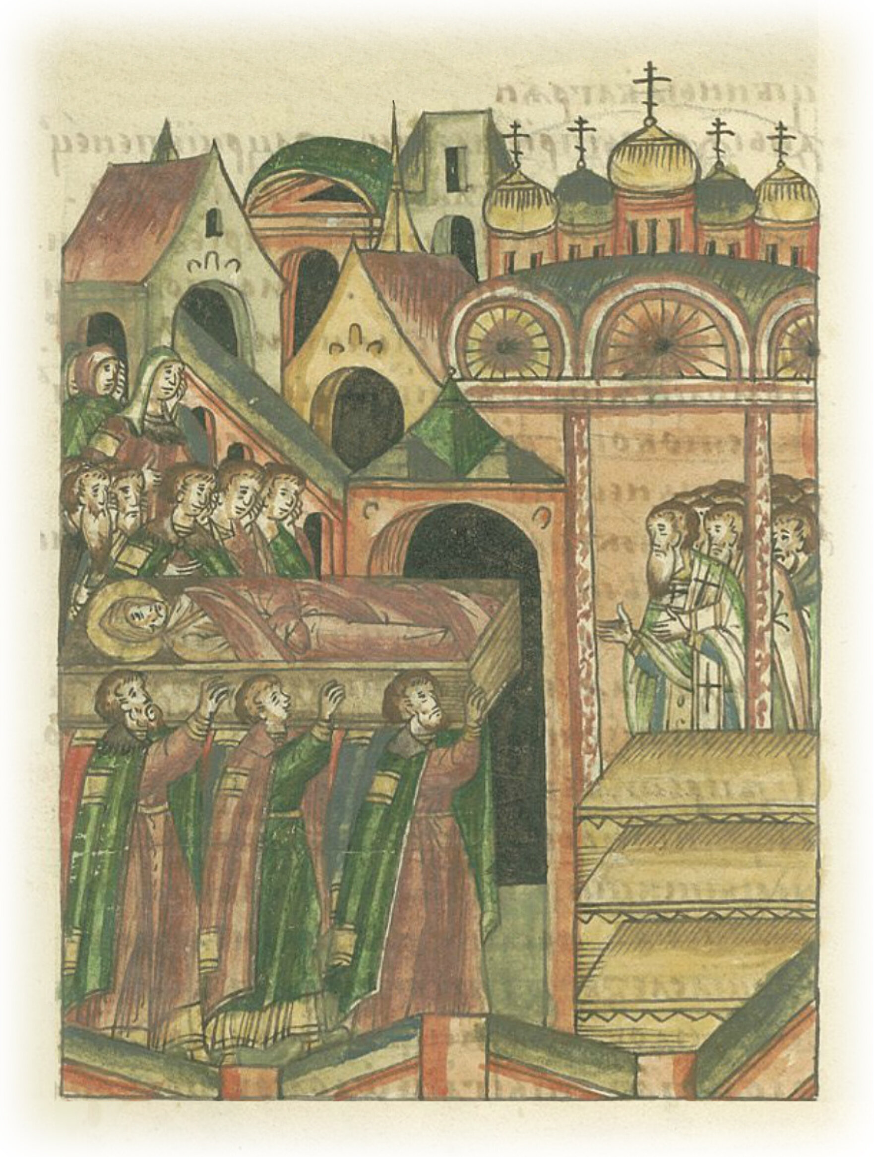 О житии и преставлении великого князя Дмитрия Ивановича. Тело умершего князя Дмитрия Ивановича вносят в церковь архангела Михаила.