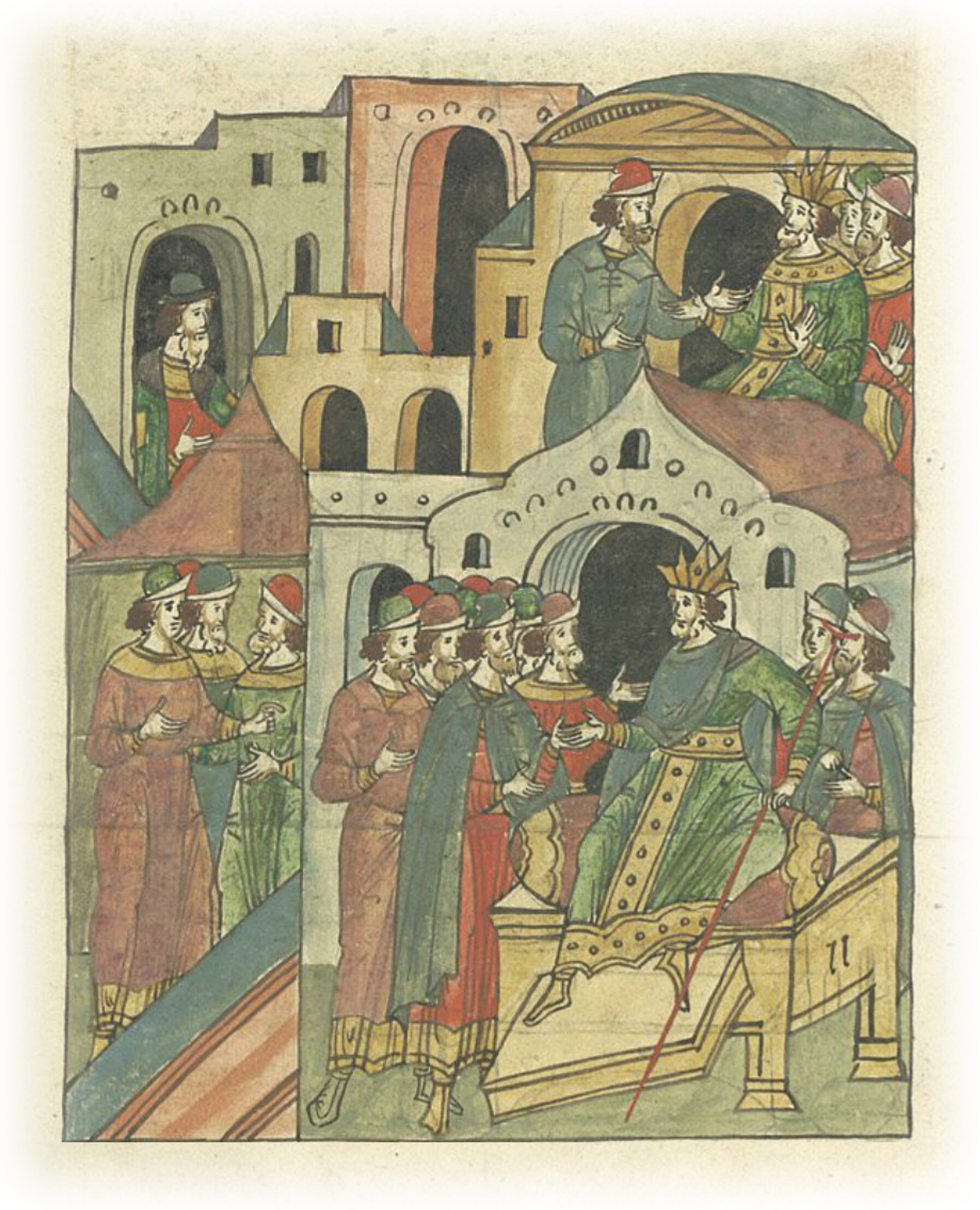 Был же Михаил в Орде у царя полтора месяца, а Кавгадый царю беспрестанно клеветал на него. Царь же, призвав князей своих, сказал им: «Судите Михаила Ярославича с Юрием Даниловичем, и, рассудив, мне скажите».