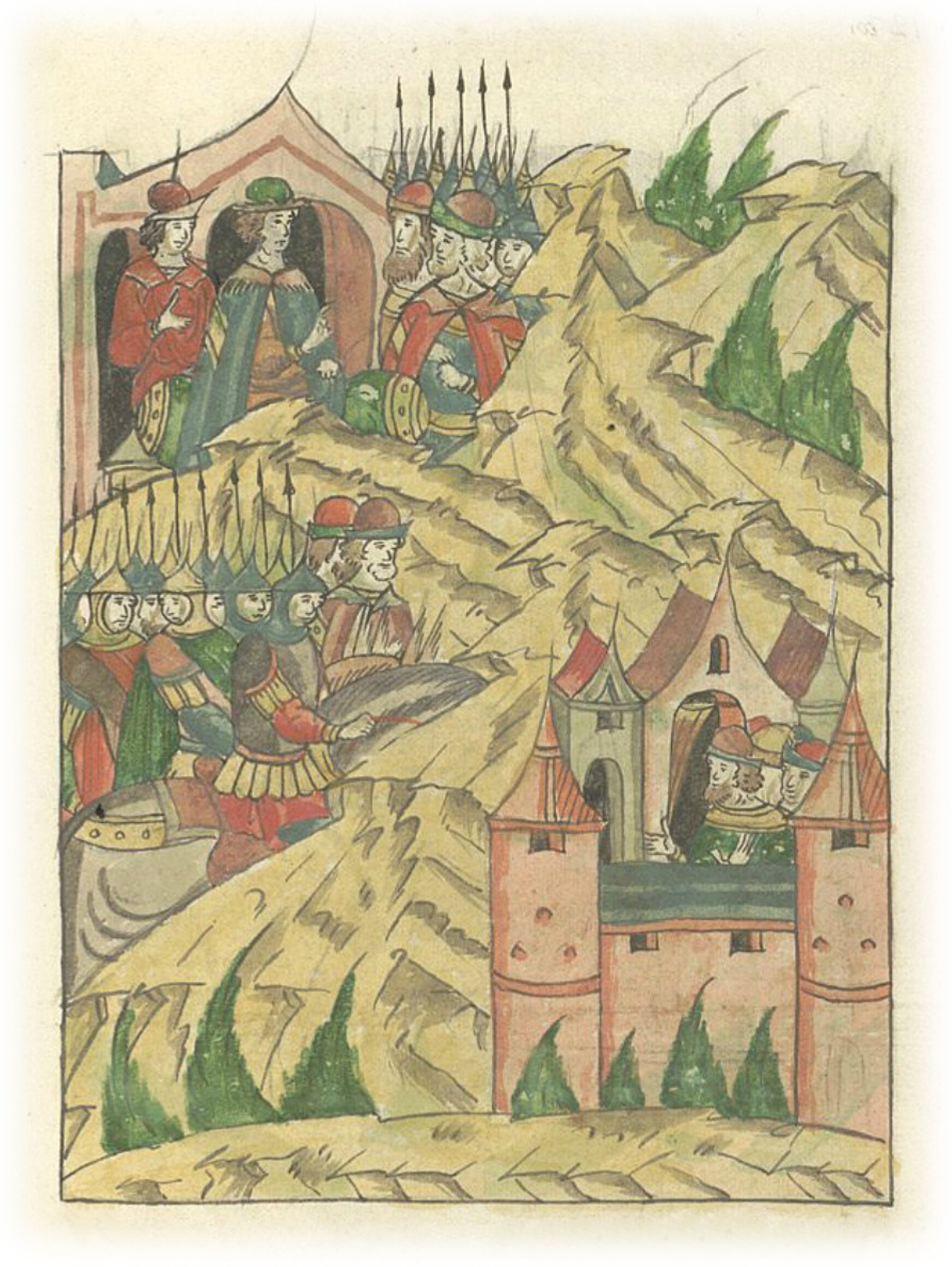 Языки говорят воеводам царя Ивана Васильевича, что магистр окопался большим рвом вокруг города Рындола, бьет из пушек и пищалей и приступает к Рындолу.