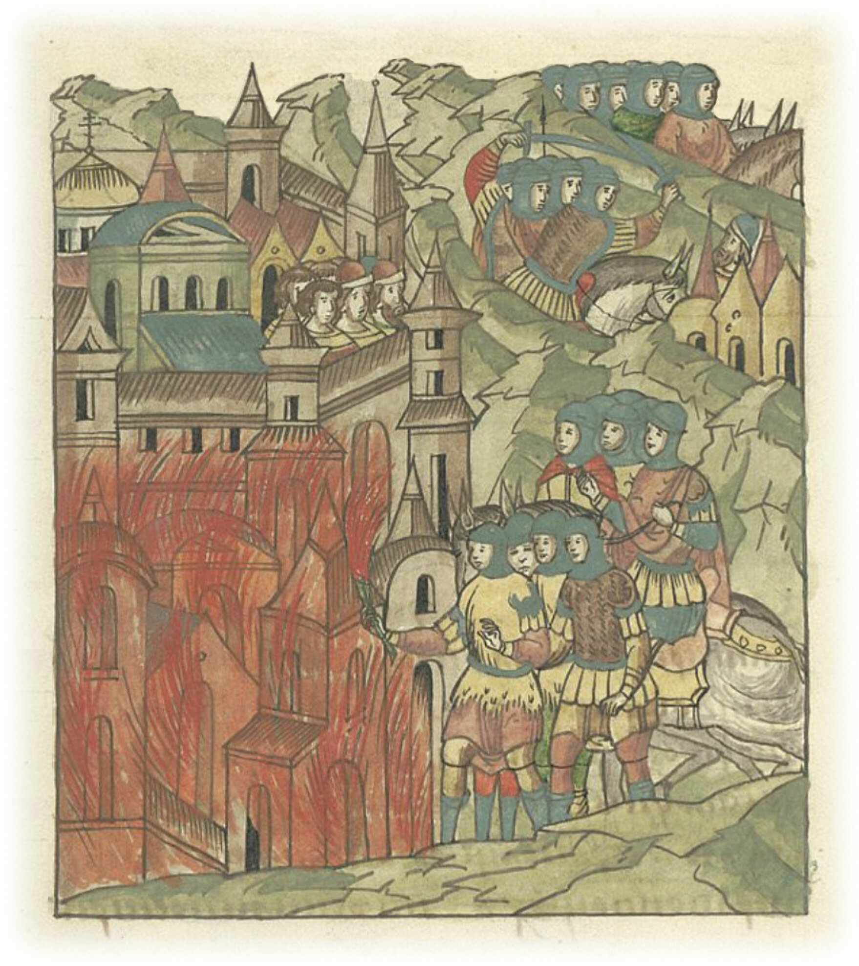 В том же году приходили немцы ратью ко Пскову в Неделю всех святых, и посад пожгли, и стояли десять дней под городом, и, много зла сотворив, ушли восвояси, воюя по городам.