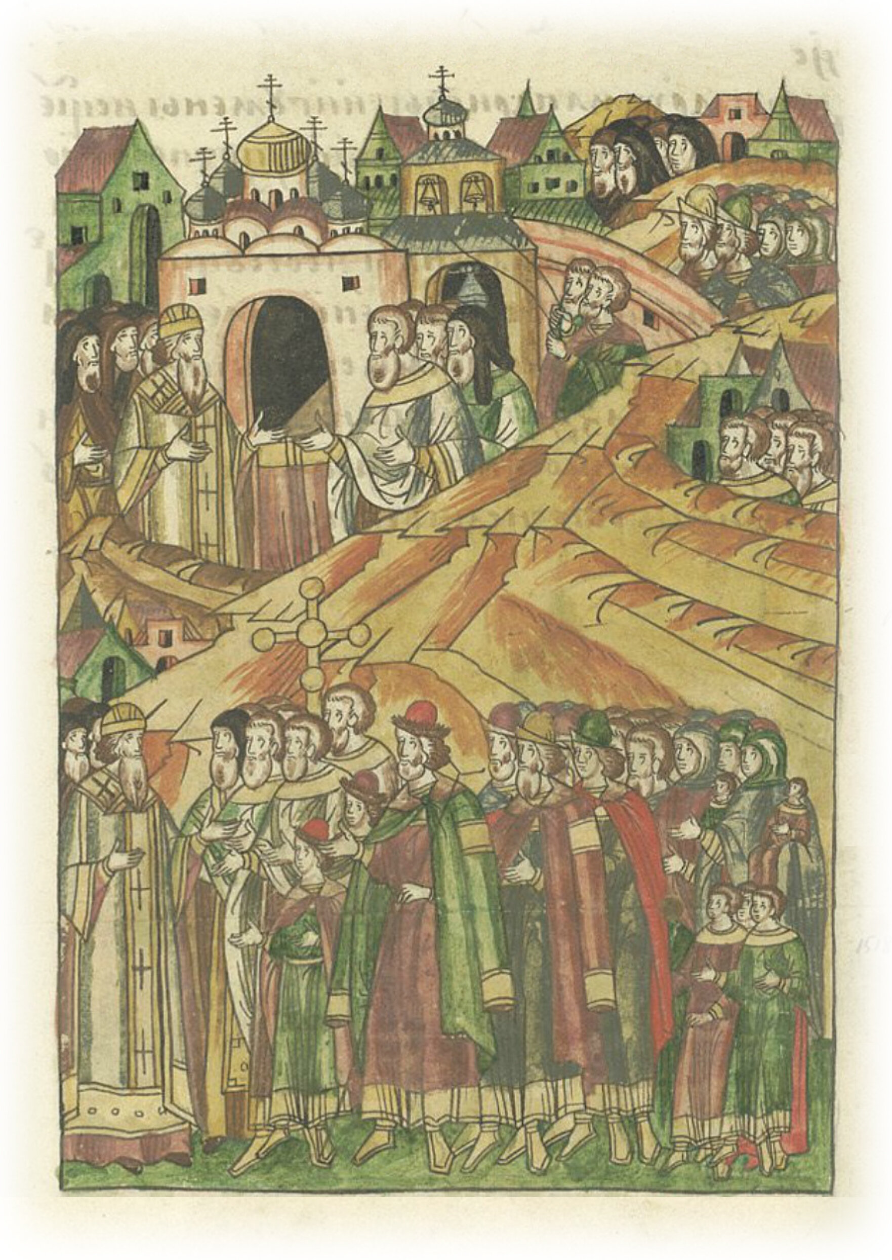 О приходе митрополита Киприана из Киева в Москву. И пришел Киприан из Киева в Москву в четверг 6-й недели по Пасхе, в самый день праздника Вознесения Христова, в 6888 (1380) году. И начали звонить во все колокола, и собрались люди, собралось много народу, отовсюду пришли архимандриты, игумены, священники, иноки, так как многие собрались на праздник Вознесения, зашевелился весь город с женами и детьми, с младенцами и даже с грудными детьми, все вышли навстречу митрополиту далеко за городские пределы. Сам великий князь встретил митрополита далеко от города вместе со своими детьми и всеми боярами с большими почестями и любовью, верой и смирением.