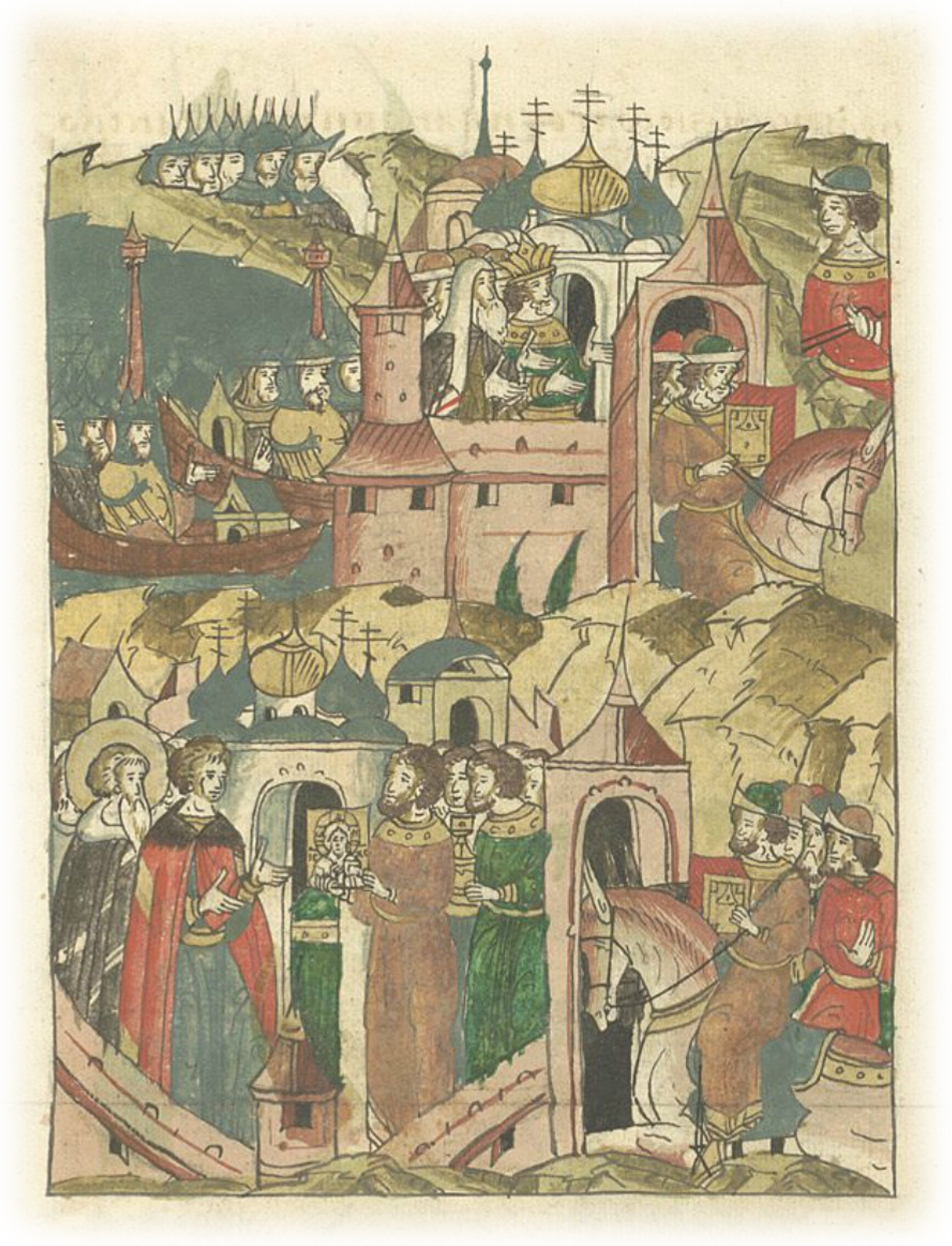 Царь, патриарх и весь народ Царьграда благодарят Русь за милостыню в помощь против турок и посылают великому князю чудную икону с изображением Спаса в белых ризах.