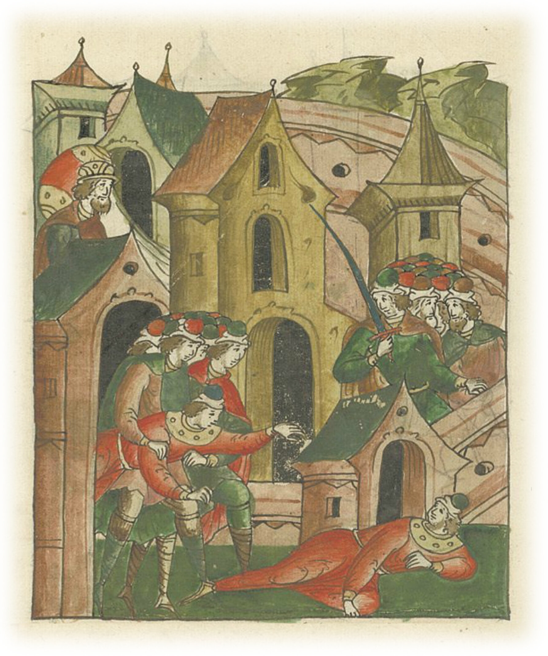 Убийство великого князя Андрея Юрьевича Боголюбского во Владимире Кучковичами. Убийцы, сочтя князя убитым, выносят тело своего друга и уходят прочь.
